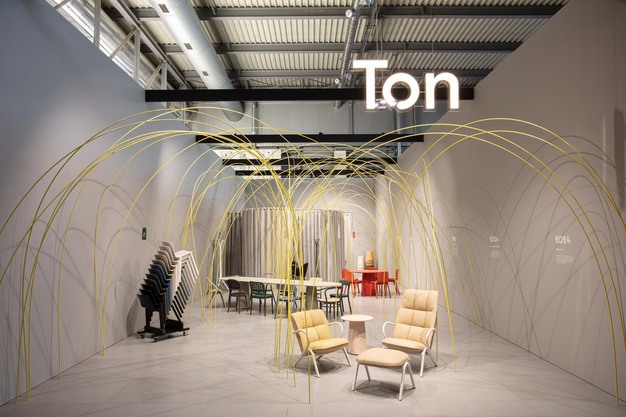 The Milan launch was accompanied by a distinctive exhibition stand, featuring yellow rods referencing bentwood technology and the brand's manufacturing heritage. Designed by Vrtiška & Žák studio, the installation presented a contemporary interpretation of Ton's longstanding craft tradition, reinforcing the narrative behind the new collection.