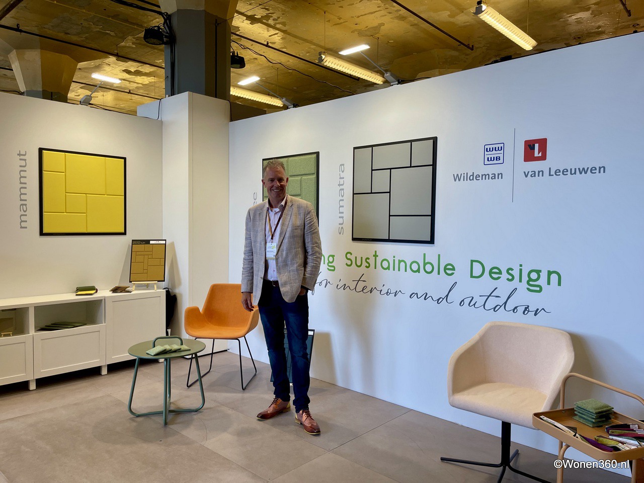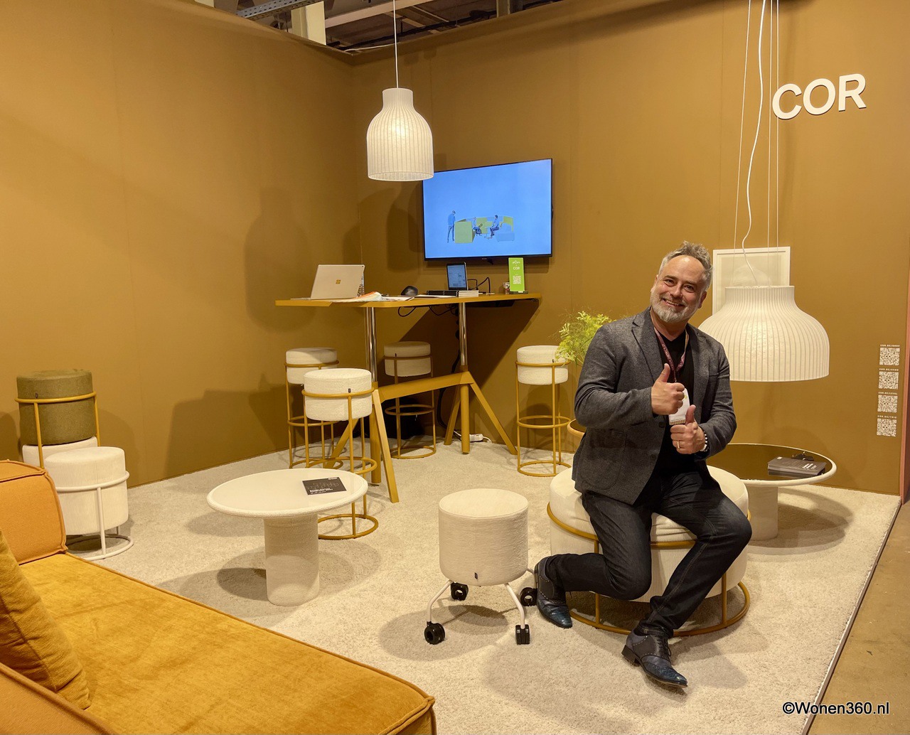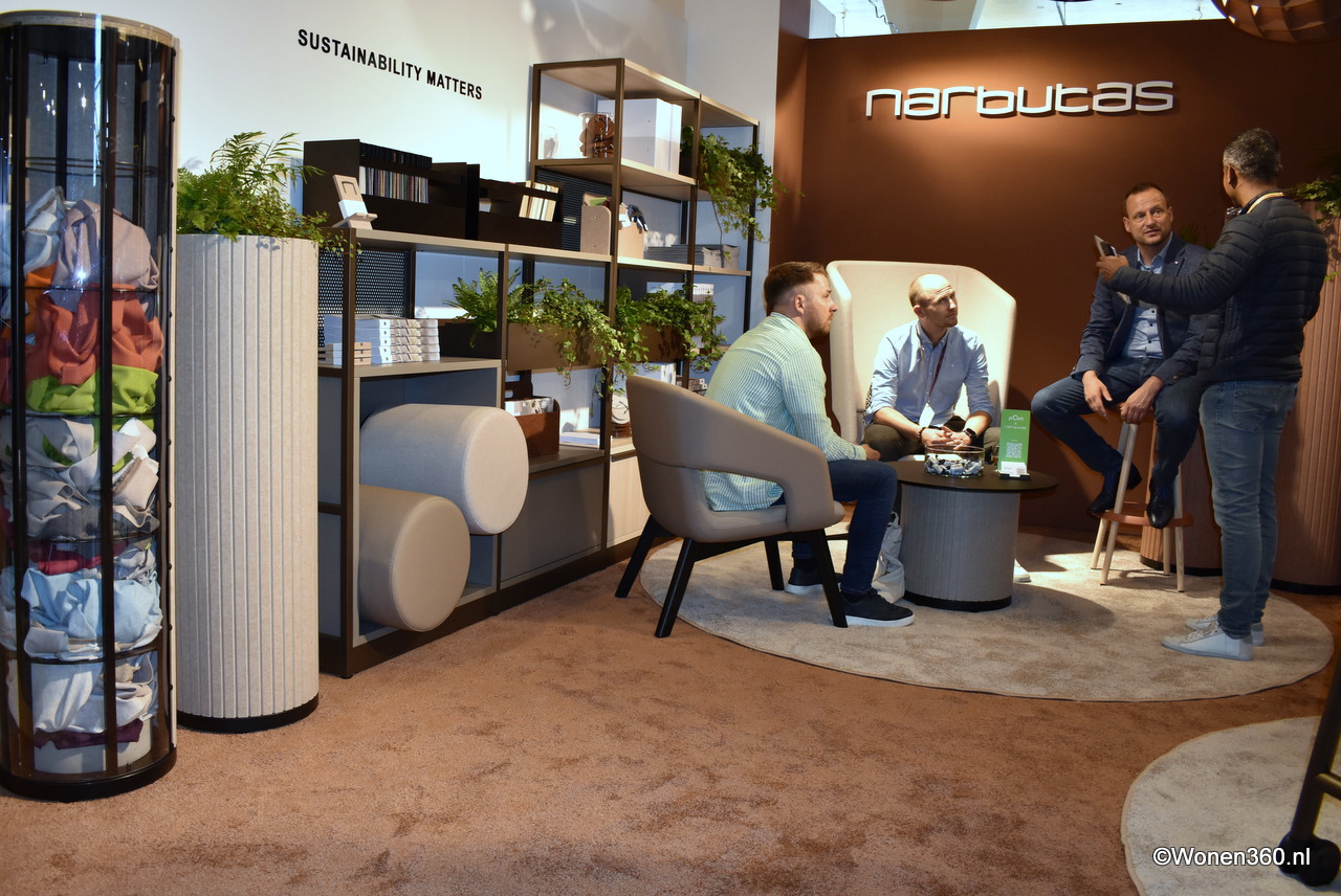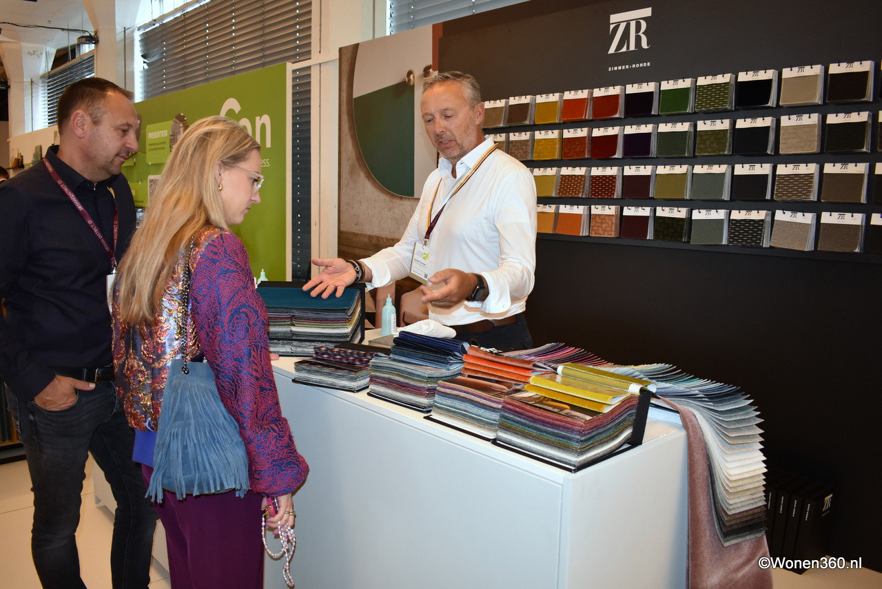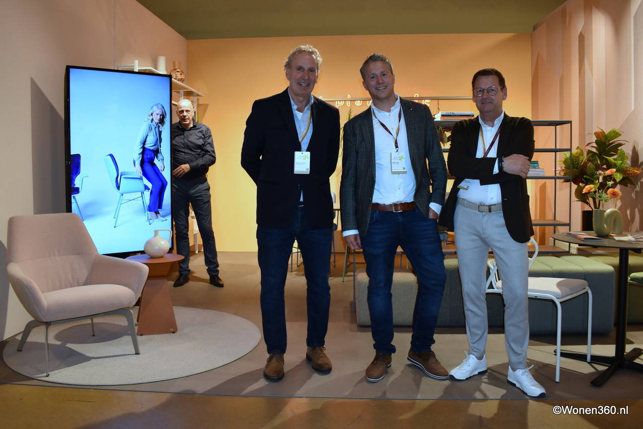 Frank van Gemert (left) of Montis is busy with visitors. In the booth, lively colors and soothing shades come together to create a balanced atmosphere.