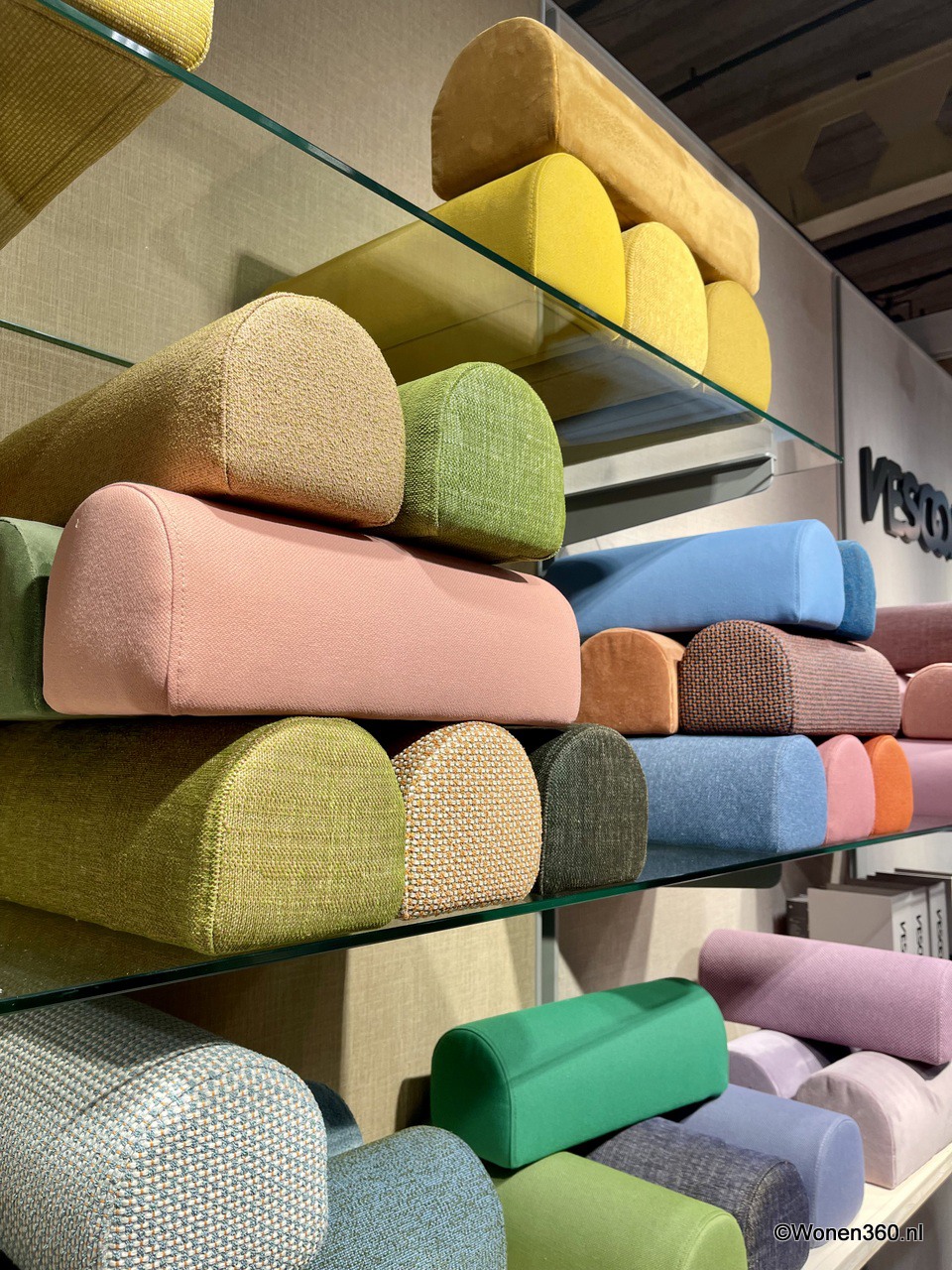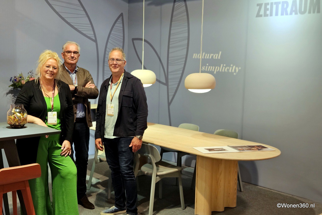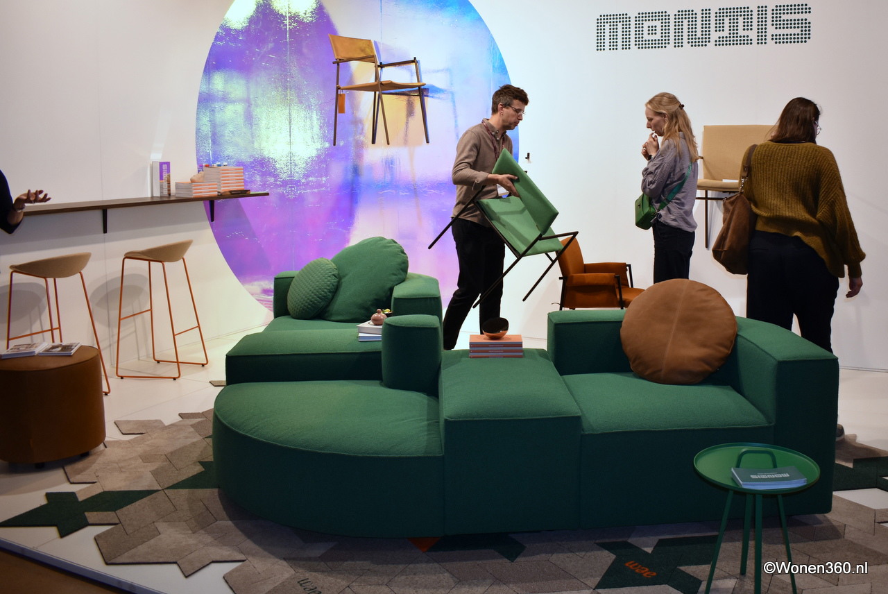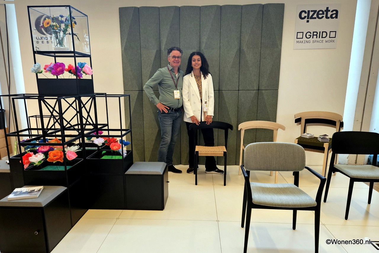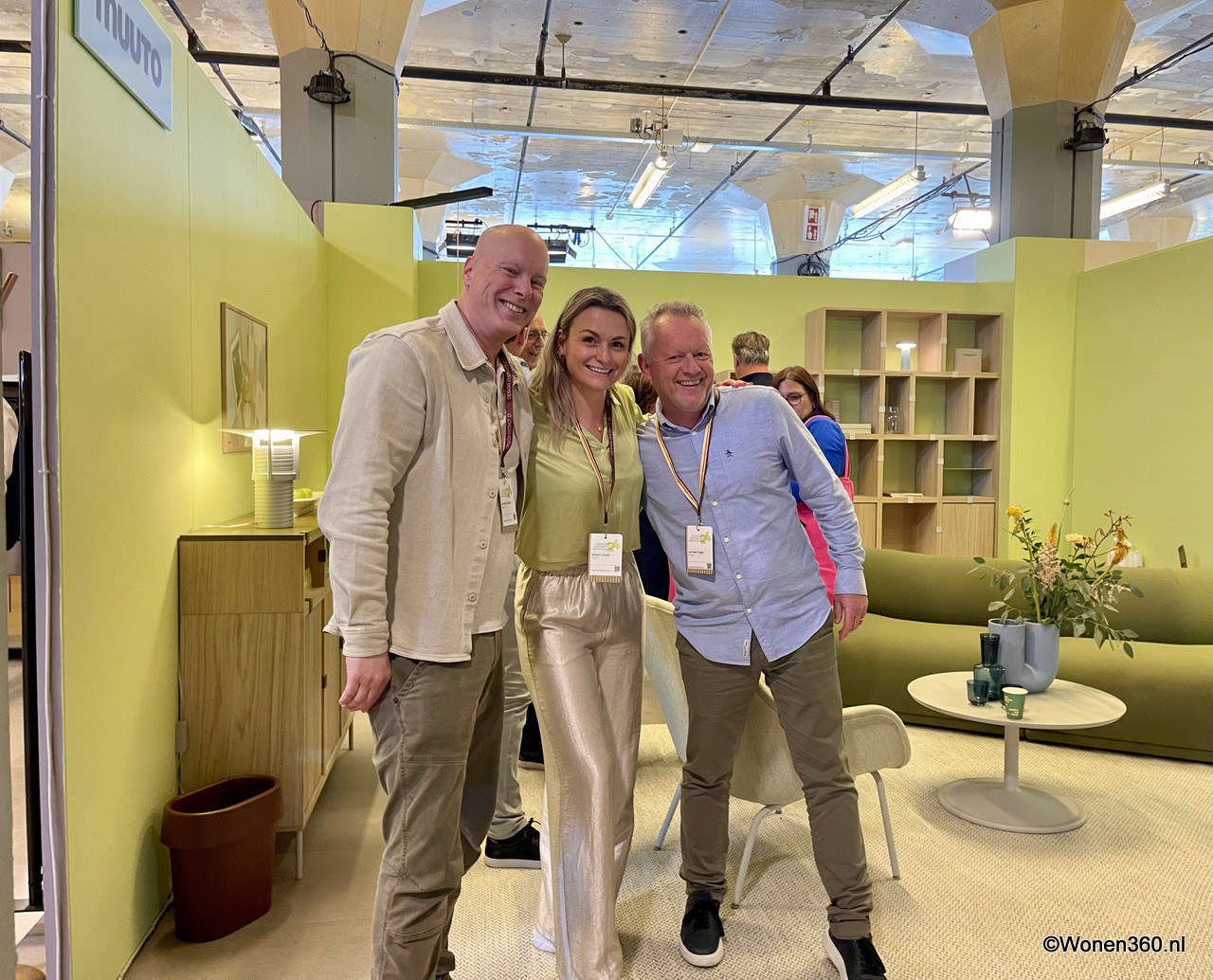Frank van Gemert (left) of Montis is busy with visitors. In the booth, lively colors and soothing shades come together to create a balanced atmosphere.
