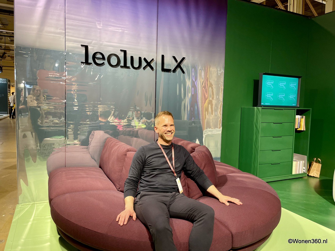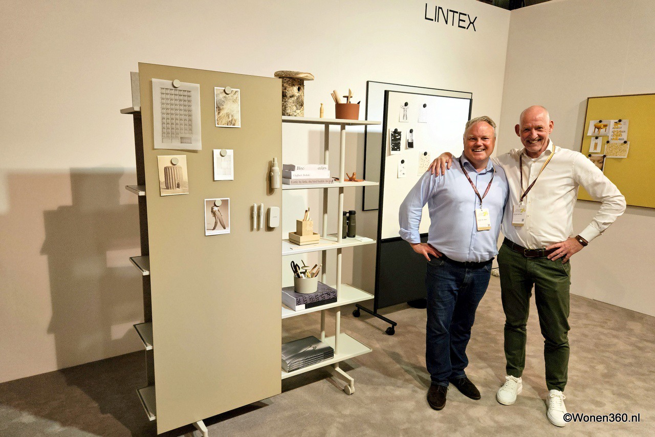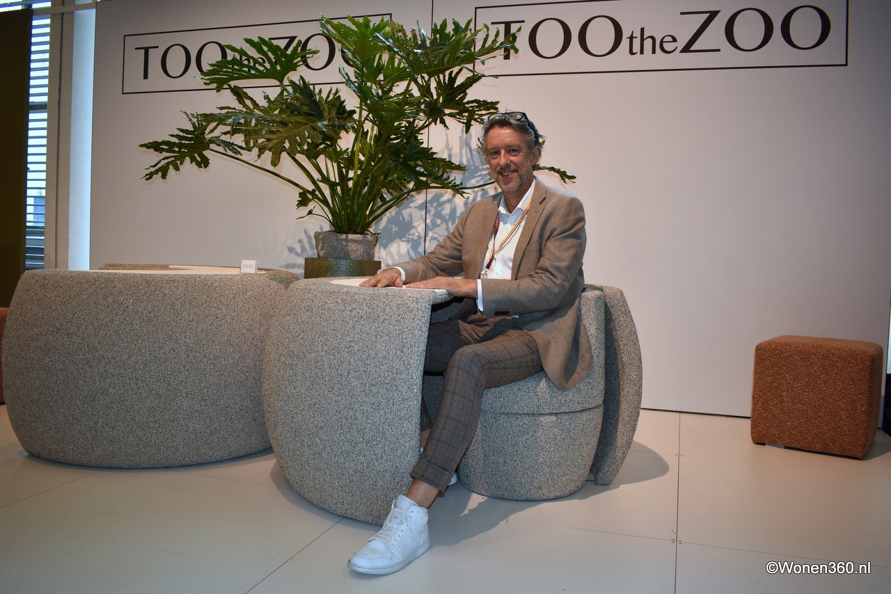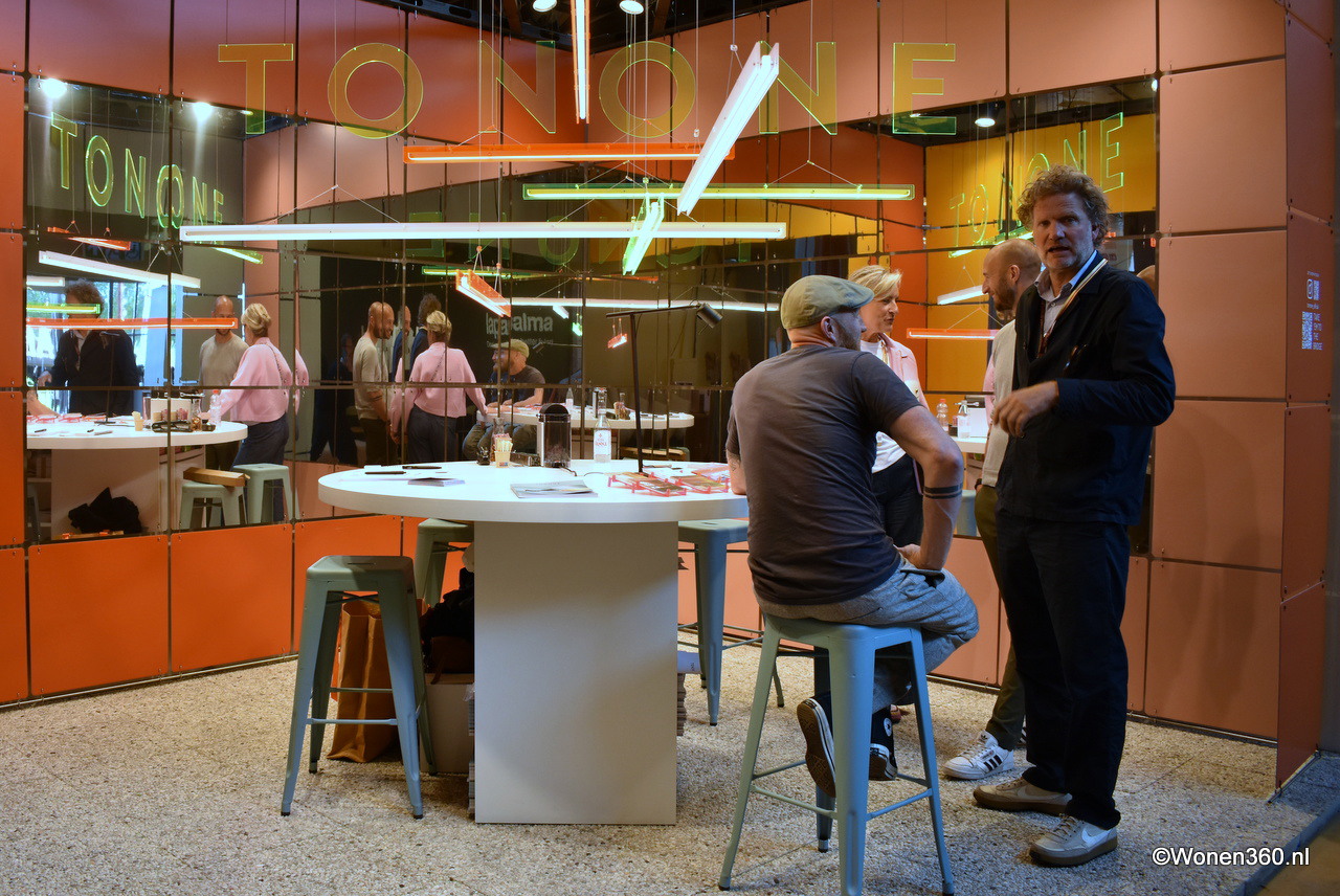 Frank van Gemert (left) of Montis is busy with visitors. In the booth, lively colors and soothing shades come together to create a balanced atmosphere.