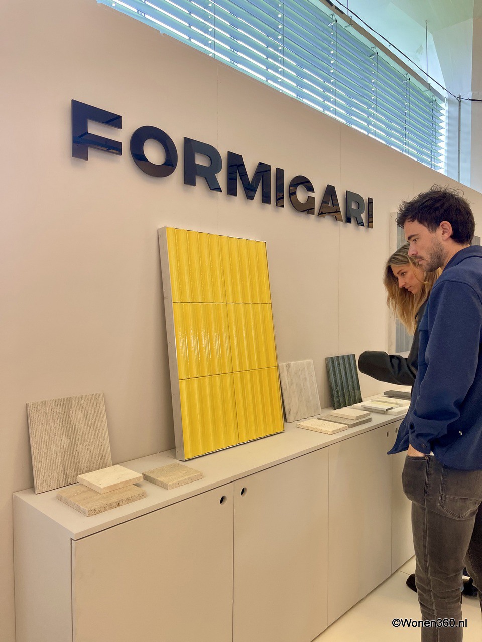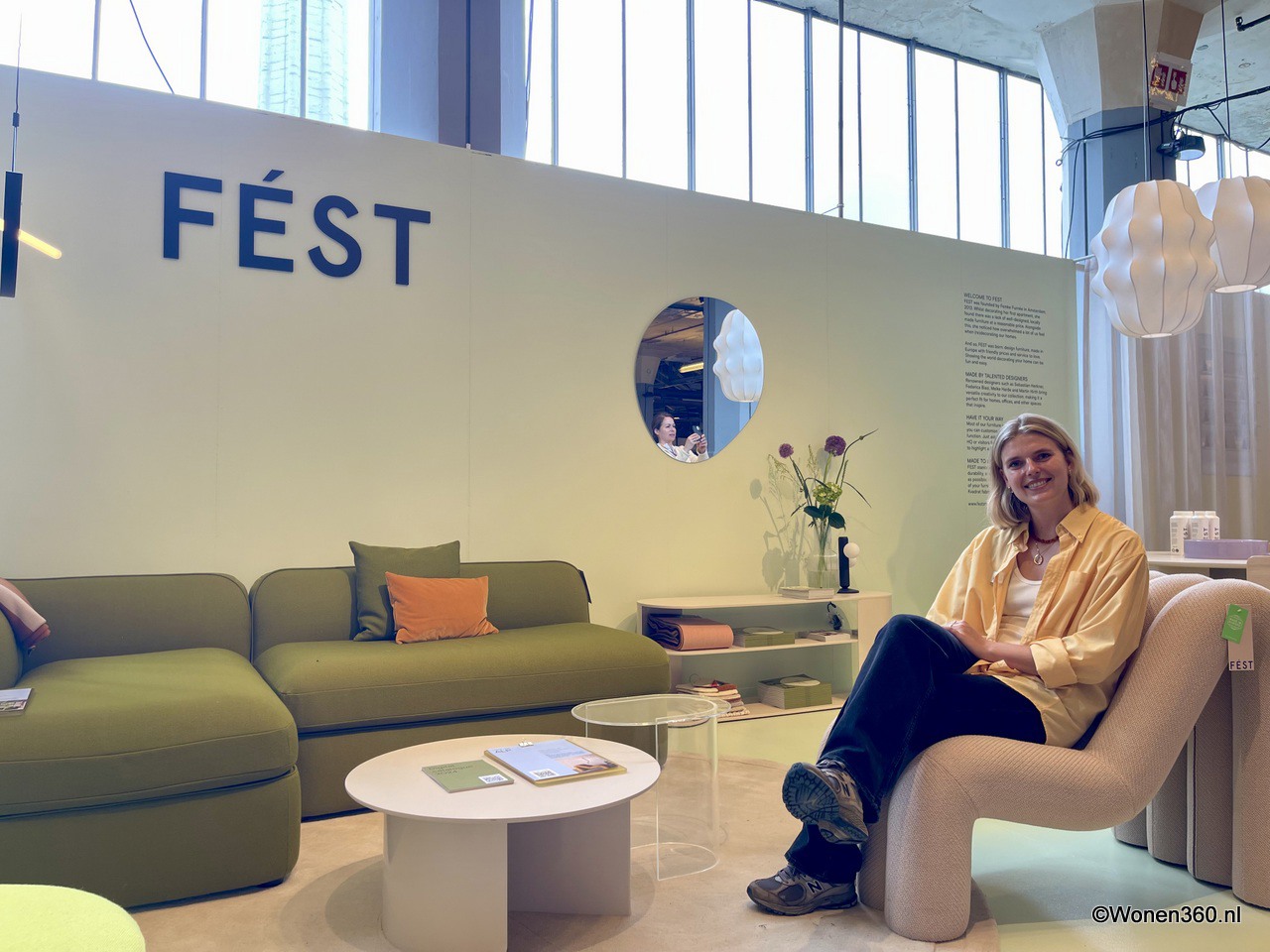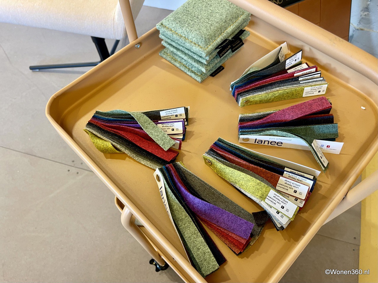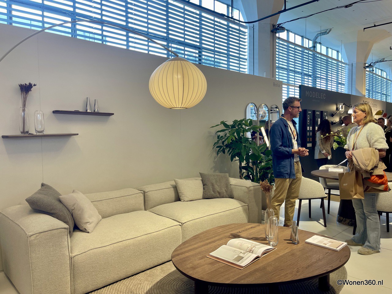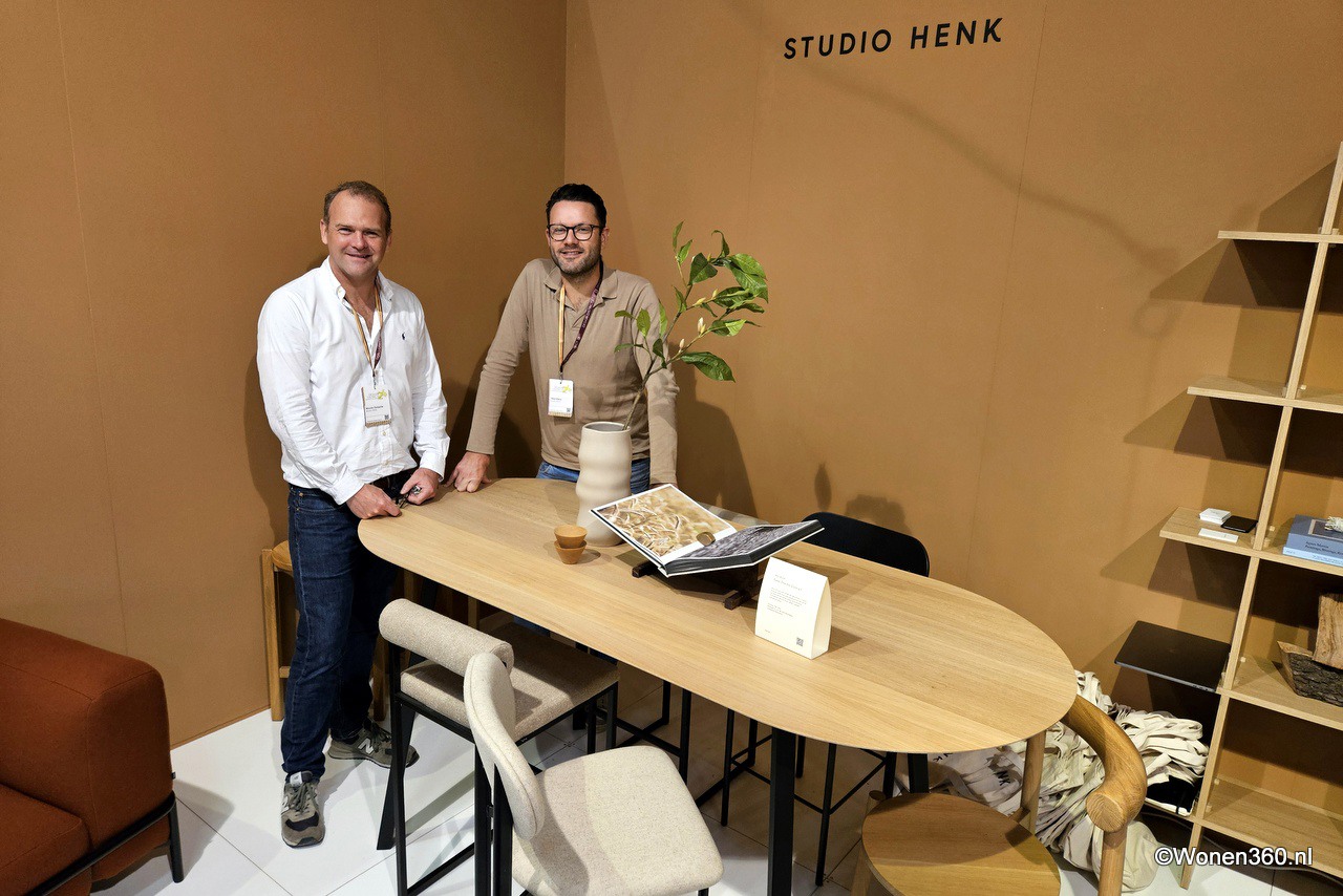 Frank van Gemert (left) of Montis is busy with visitors. In the booth, lively colors and soothing shades come together to create a balanced atmosphere.
