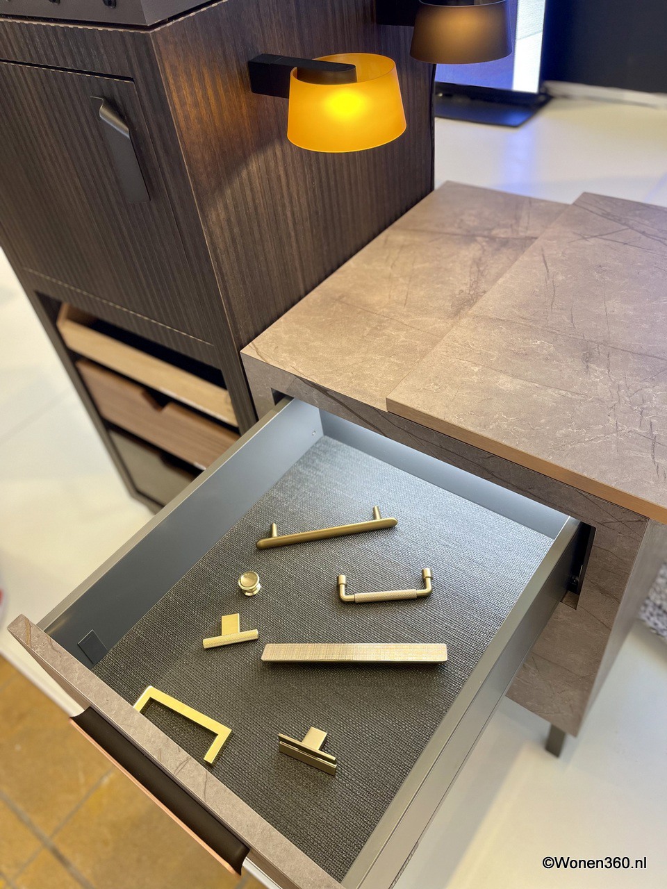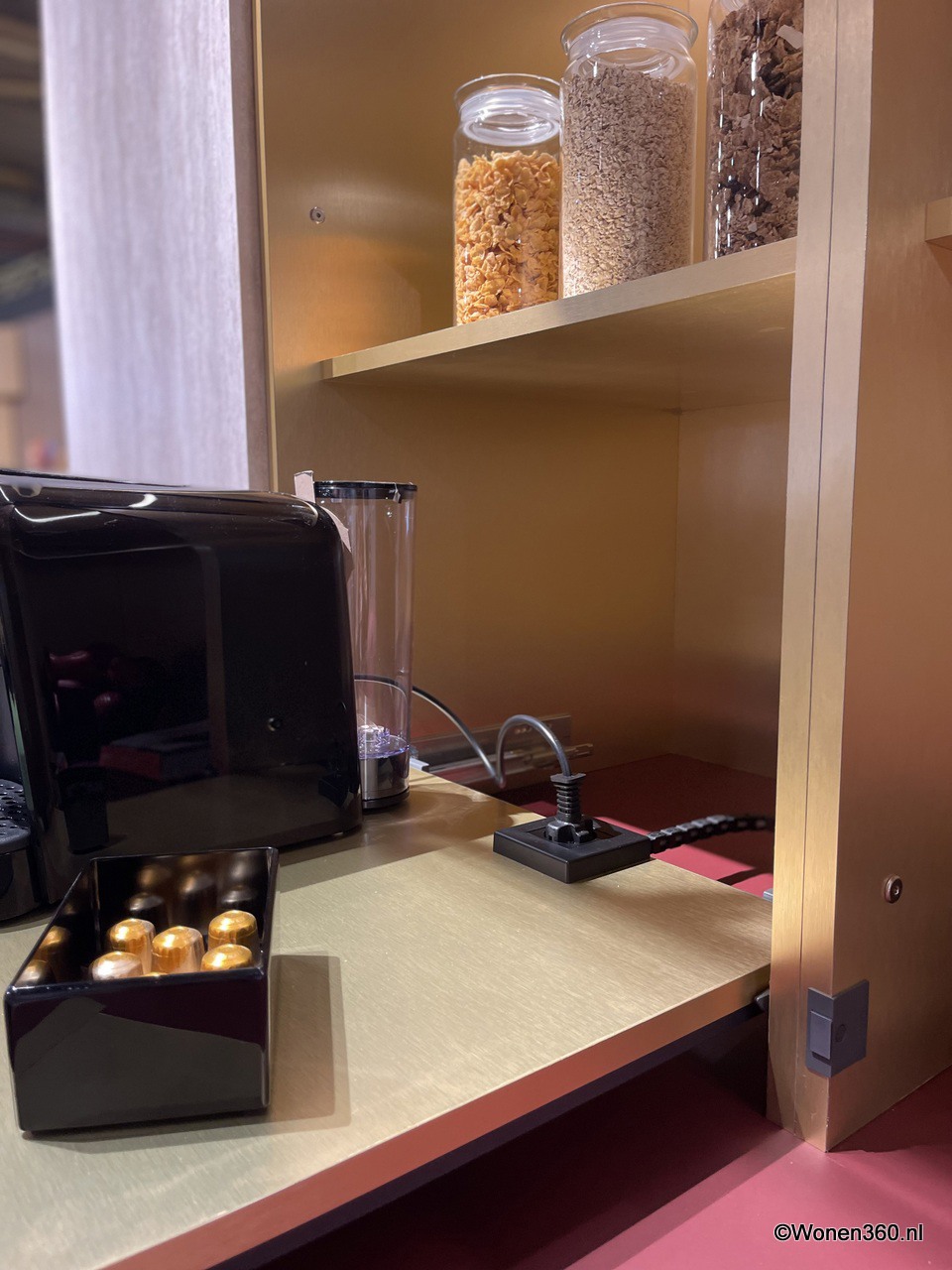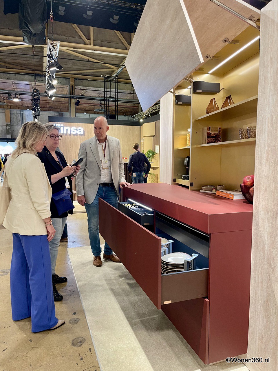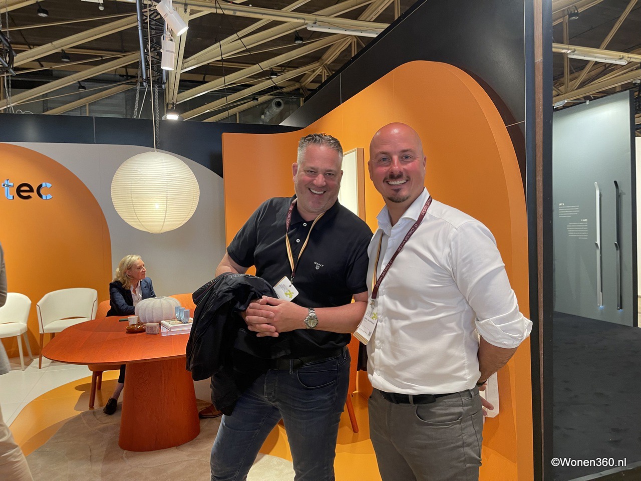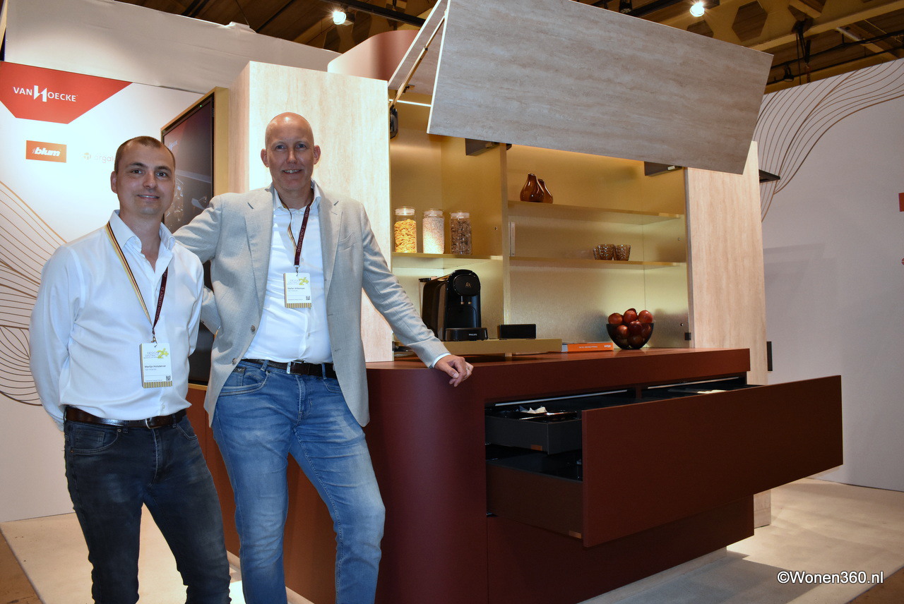 Martijn Holsderver (left) and Stefan Willemsen from Van Hoecke (distributor of furniture fittings). In addition to many technical feats that support design possibilities such as Revego and Aventos, this year they also premiered Amperos for the first time. A unique way to bring power and light into the drawer and the furniture, thus once again allowing convenience and design to go hand in hand.