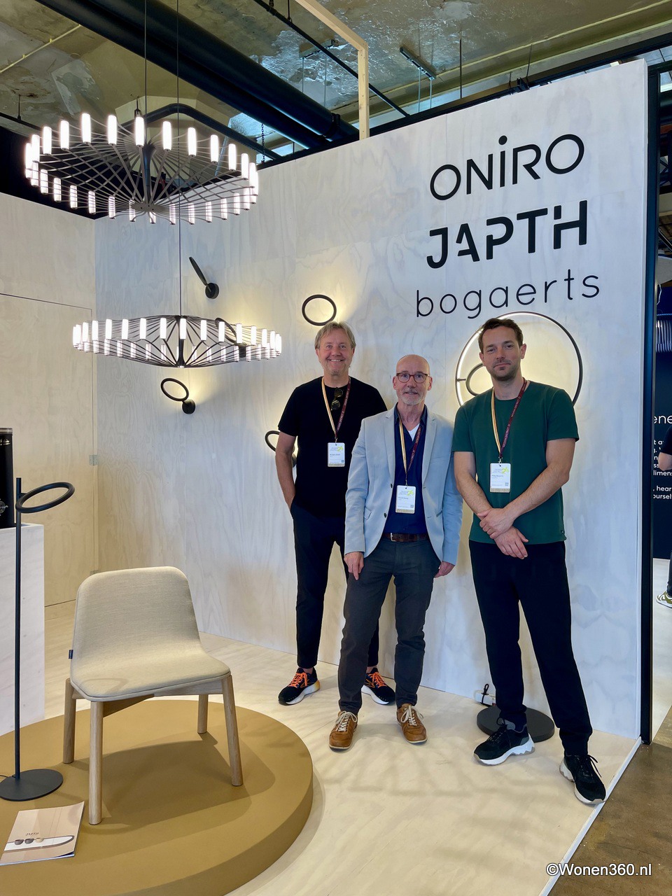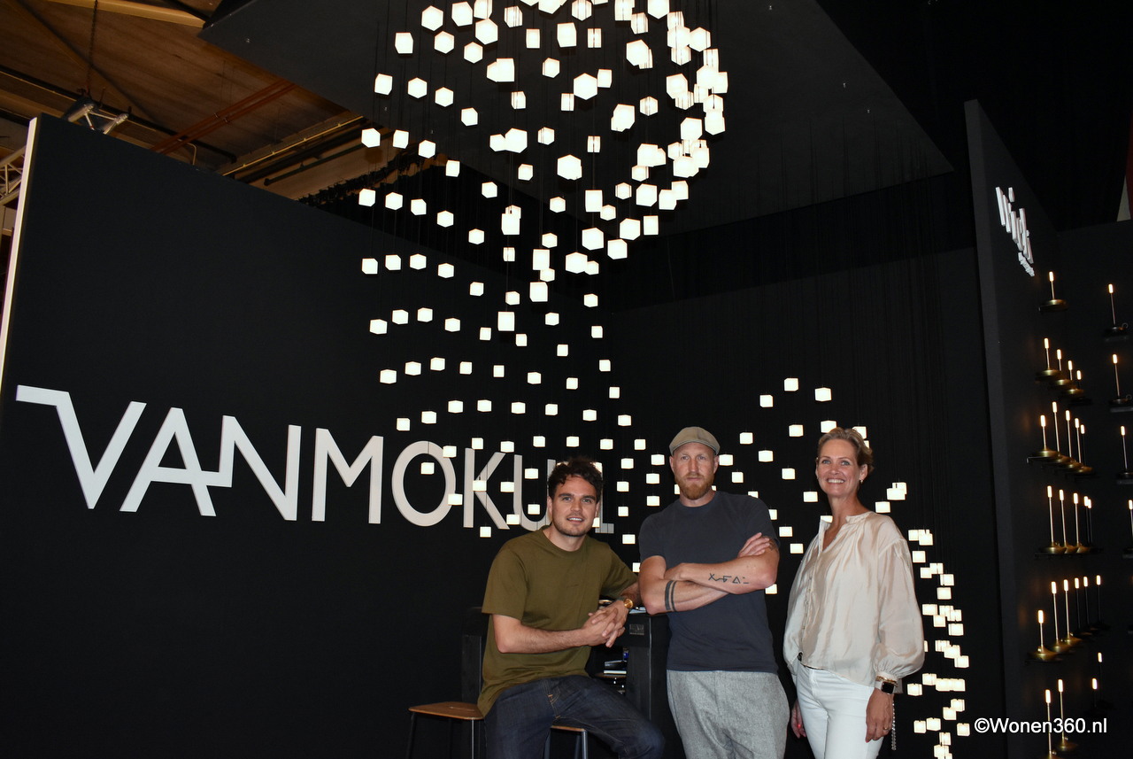 Timo Keultjens, Arno Ruijzenaars, and Mariëlle van der Wal from VANMOKKUM, with behind and above the new Loci from the lighting brand Graypants.