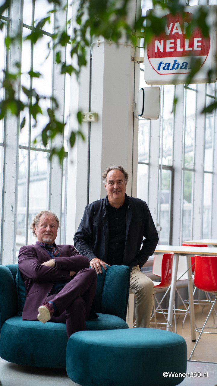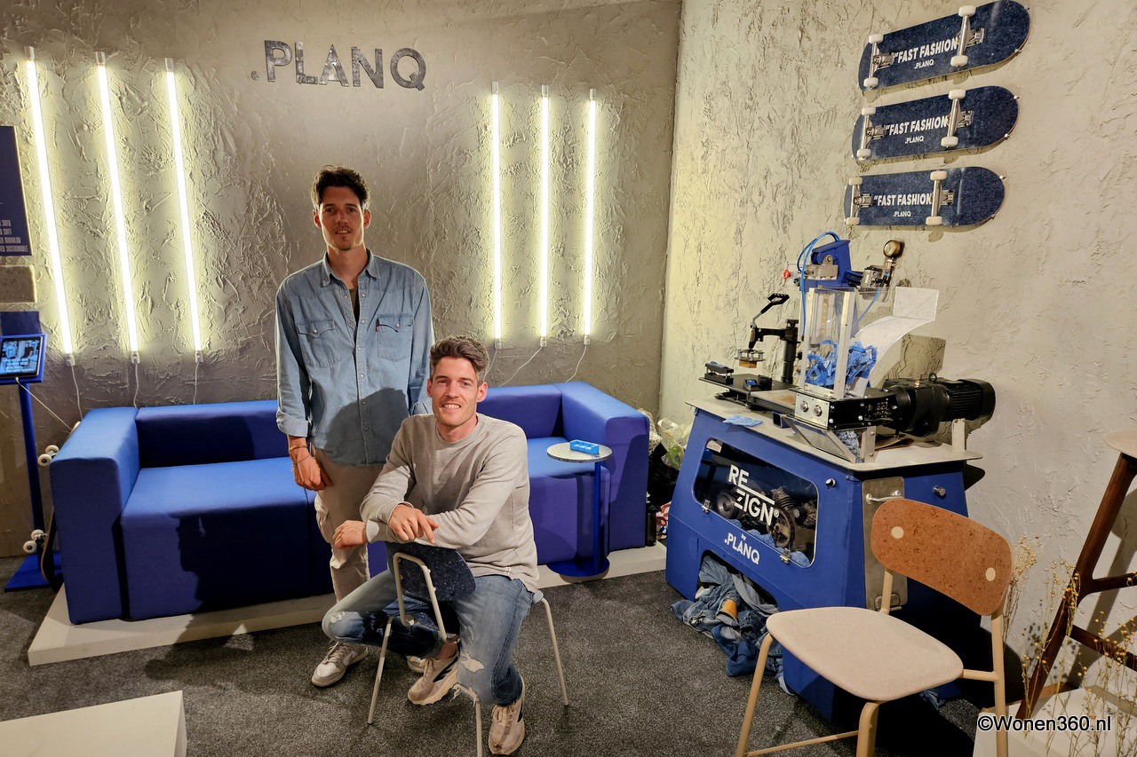 Twin brothers and entrepreneurs Dennis and Anton Teeuw, the founders of Planq. In the background, a new sofa concept, Super Sofa, can be seen.