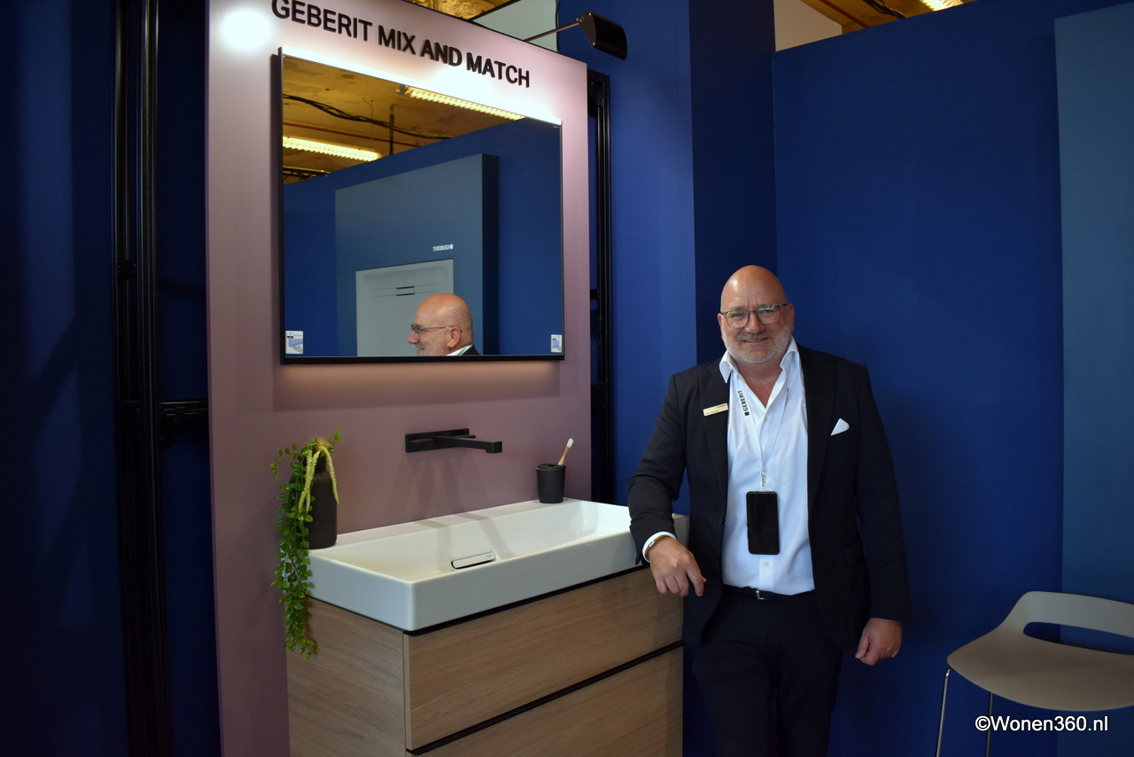 Rico Gerardu poses with the new bathroom furniture collection Mix & Match from Geberit.