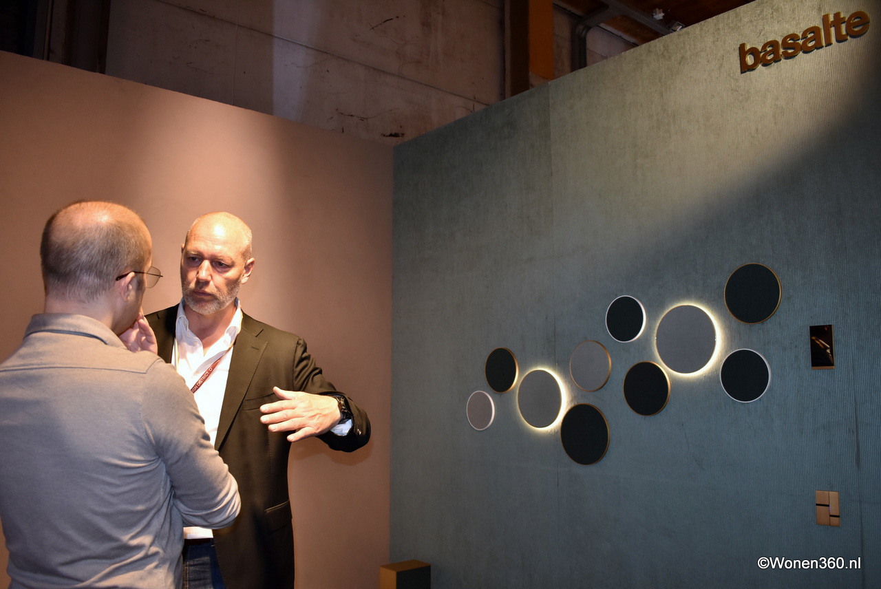 Jeroen Kuiper (right) from Basalte in conversation with a visitor. On display were multifunctional design keypads, refined speakers, and elegant iPad holders.