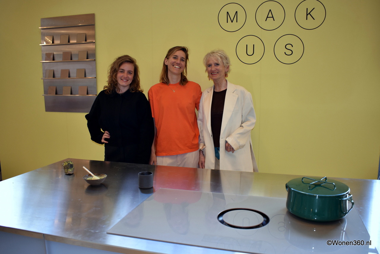Mirjam de Bruijn, Merel Philippart (founder) and Bernadette de Leeuw (from left to right) at the stand of Makus, which presented the MAKUS Moon at Design District: the world's first induction cooktop with extraction and color.