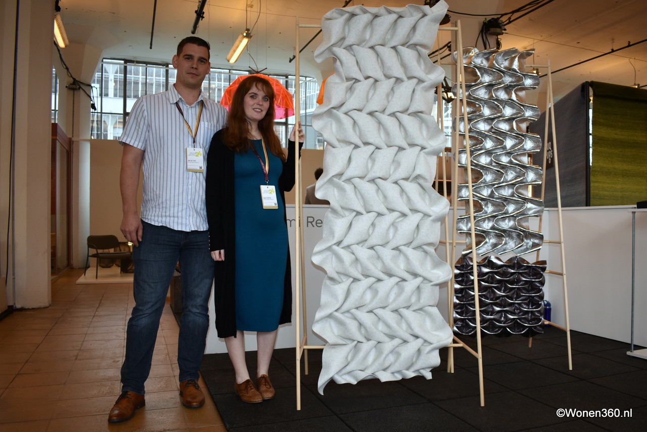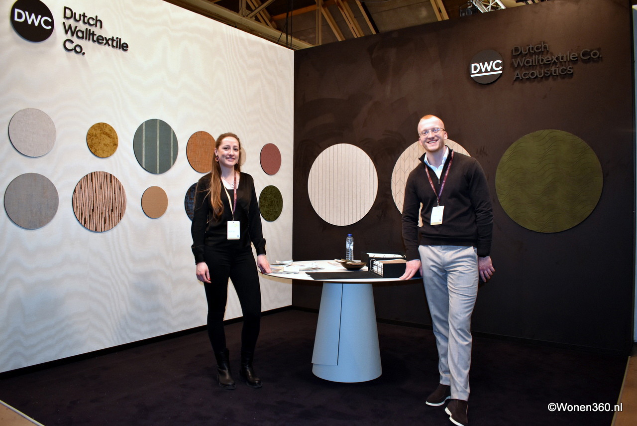 Laurien Vogel and Kevin Berkhout from Dutch Walltextile Co. (DWC), which showcased new acoustic textile panels. The company is known for producing "the finest and most luxurious wall textiles intended for high-end interiors."