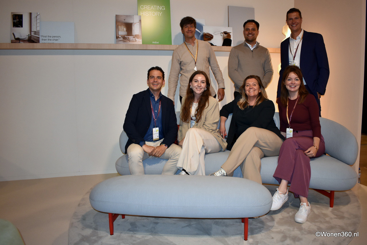 The team of Artifort\Lande on the luxurious, sculptural Muse sofa (with a curved, arch-shaped back), from left to right in the back row Kees Tol, Ron Davies, and Vincent van den Broek and sitting Maurits van der Lande, Anouk Jager, Barbara van Poucke, and Annemijn Evers.