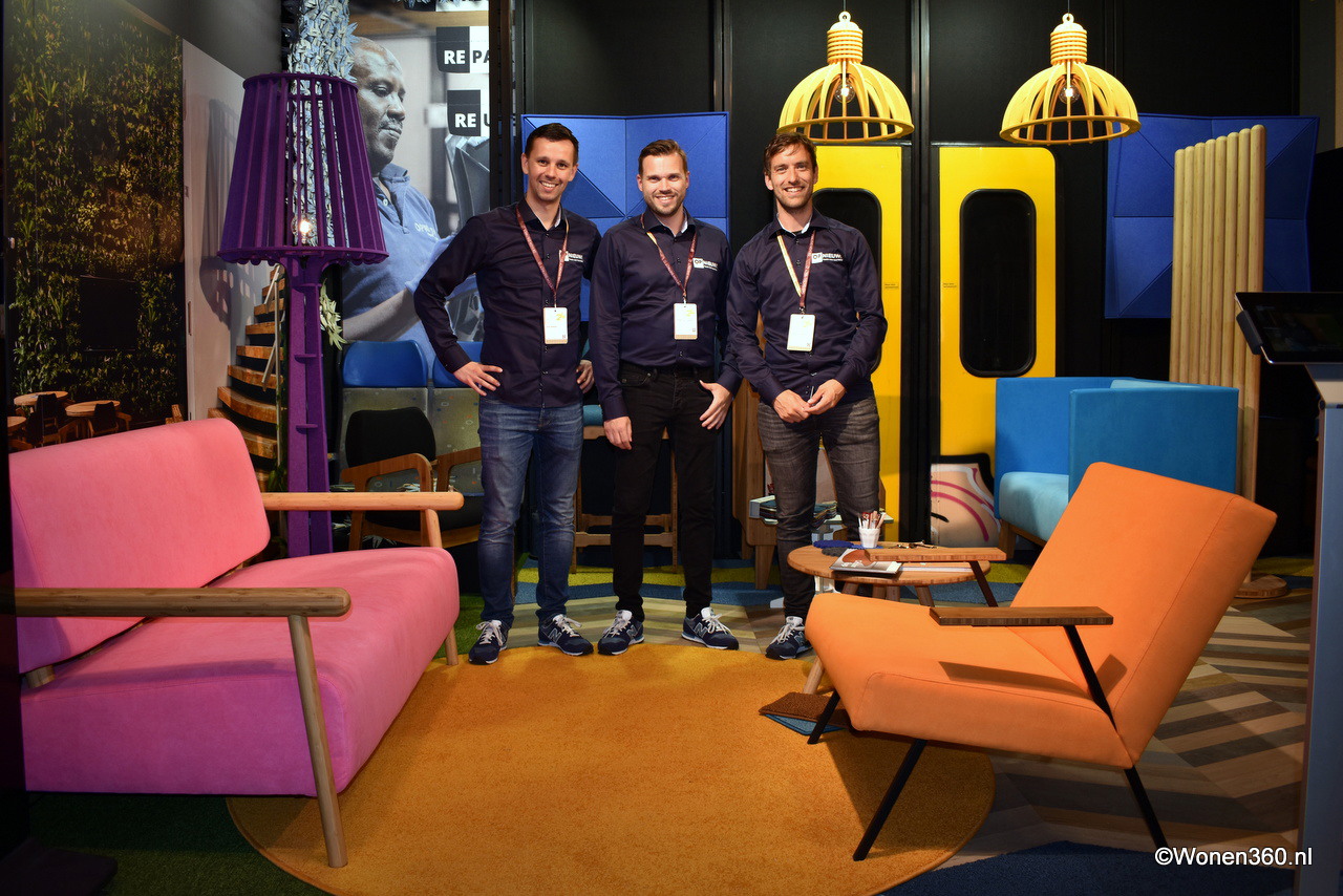 Rick Bremer, Robert op 't Land, and Kees Noordmans (from left to right) in the colorful booth of OPNIEUW!, specializing in second-hand furniture that they revitalise into refurbished furniture for offices.