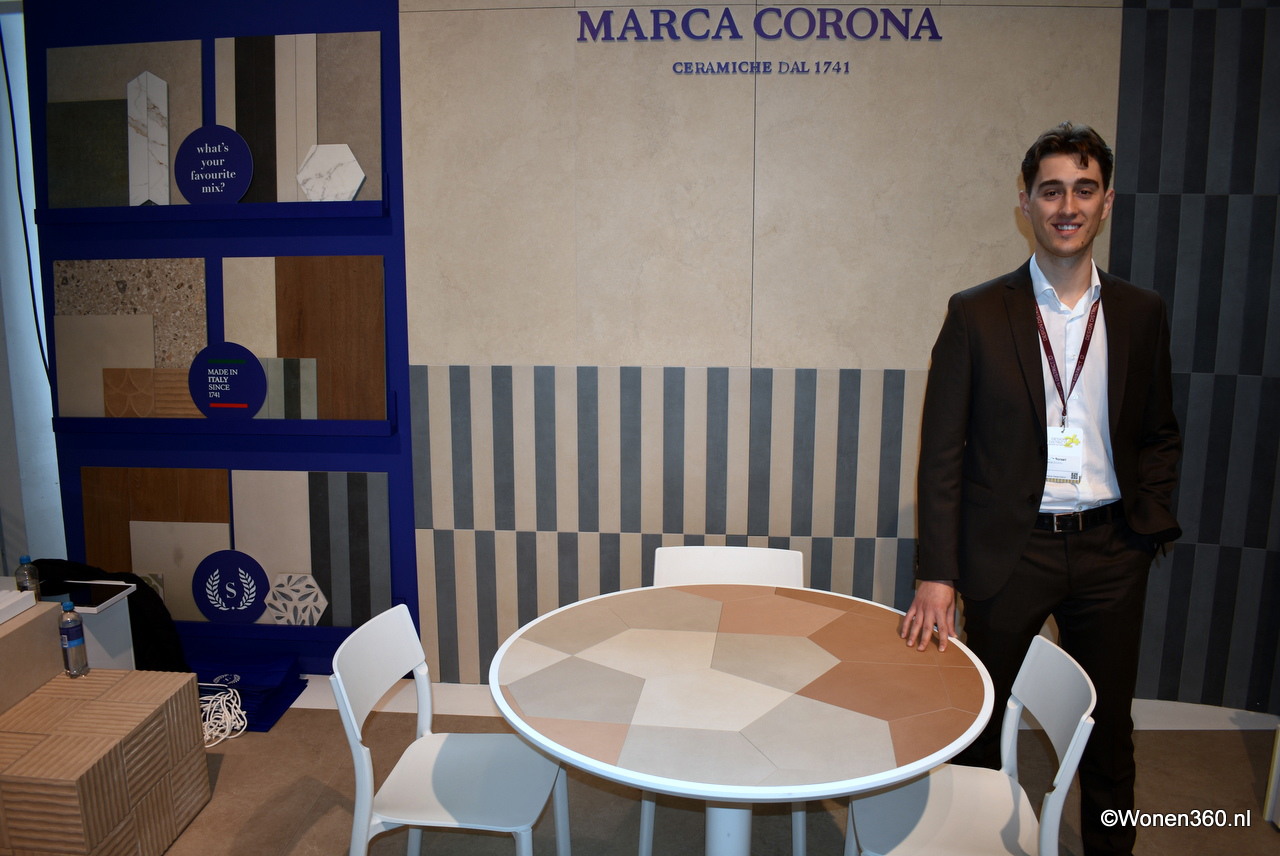 Nicola Borsari from the Italian ceramics company Marca Corona, founded in 1741, posing with a new project collection of floor tiles, available in the size 1.20 x 1.20 and in four colors.