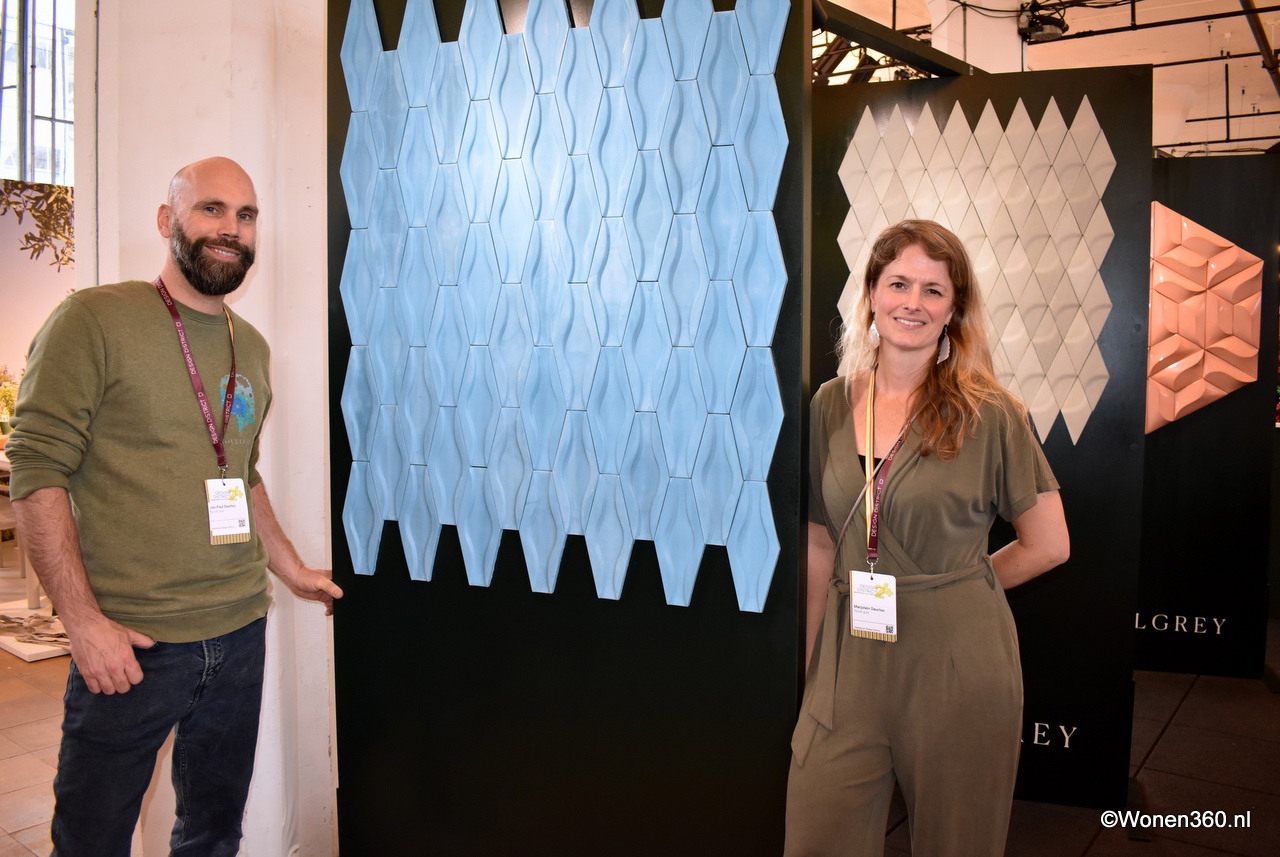Jan-Paul and Marjolein Deurloo from Novel Grey (specialists in wall decorations with a unique look and feel), posing with the new collection Chapter Two, which, unlike One, is easier to use and also easier to process.