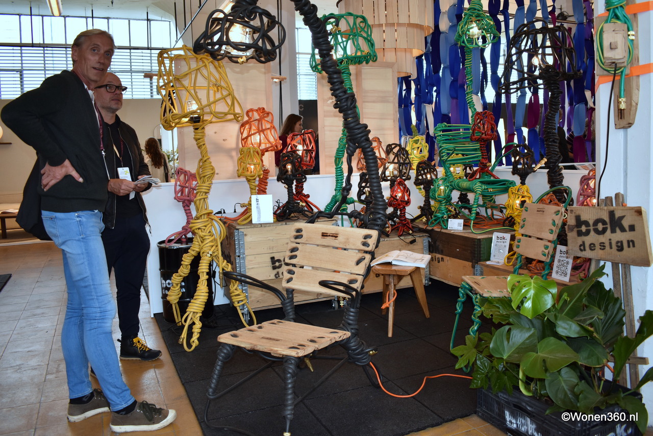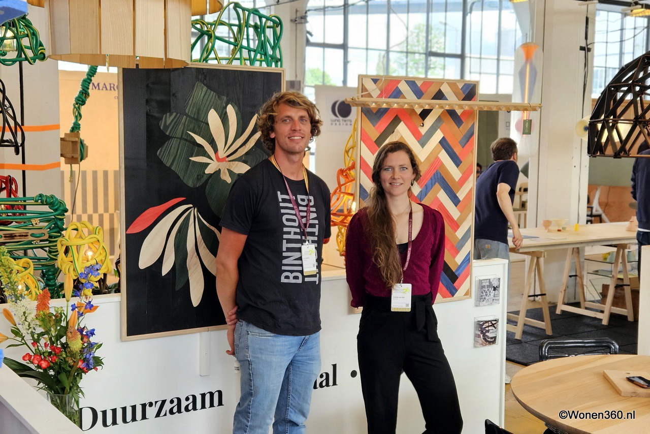 At the booth of Social Enterprise Binthout, Cor Wobma and Jouktje van Dijk can be found. A new table, lighting, and wall decoration were brought to attention.