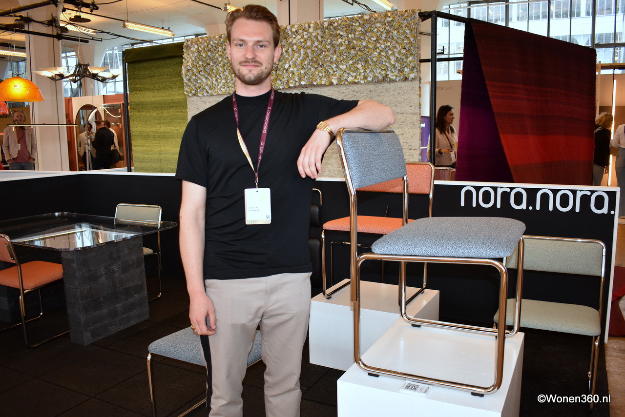 Aaron van Bindsbergen from nora.nora poses with the new chair collection, which he himself calls archetypal design for pragmatic sustainability. The noranora collection is inspired in design and comfort by the function of the product and makes a statement with it.