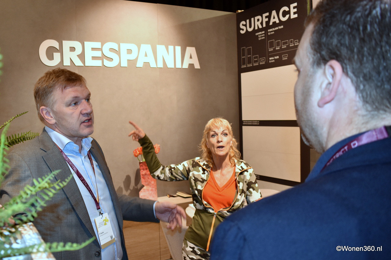 Paul Sulzle and Erna Heijink from Grespania in conversation with a visitor. The stand displayed ceramic products that are innovative in terms of properties and design, including the new Coverlam collection.