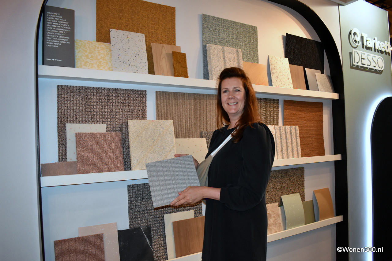 Marie-Neeltje van Weerelt from Tarkett with the acoustic collection Baux. At Design District, the collaboration between Baux and Tarkett was presented. With the Baux Acoustic Wood Wool Panels and the Desso AirMaster® floor technology, the acoustics are optimized and the indoor air quality is improved.