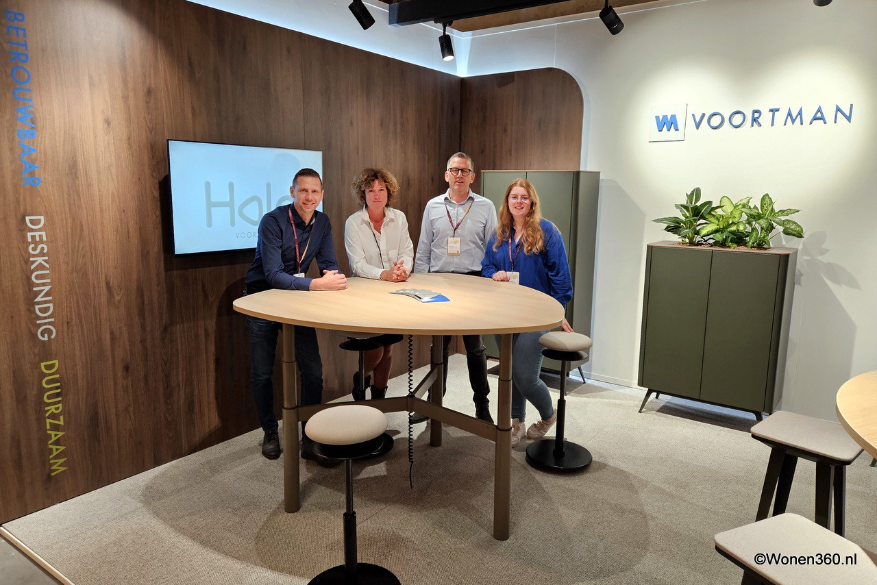 Mick Wiskamp, Lianne van de Venn, Arie Drost, and Demi de Groot are standing around the new Halo meeting system from Voortman Office Furniture.