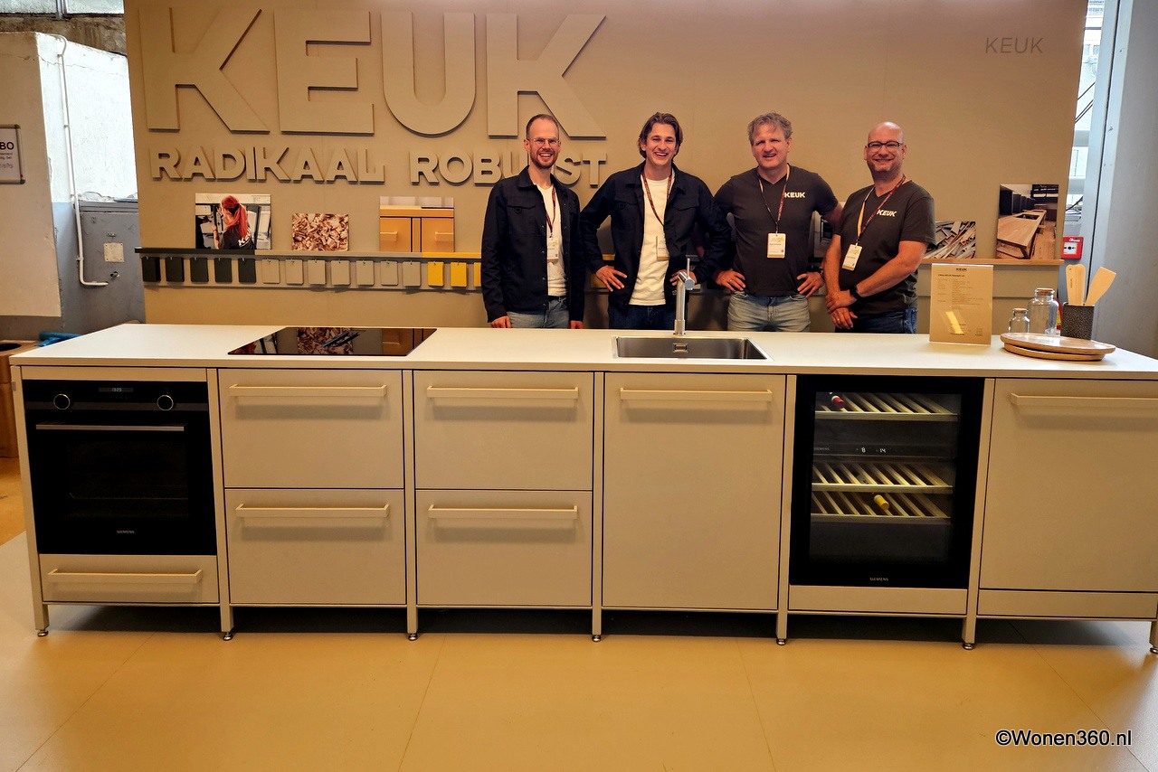 Daan Hutten, Niek Kompinga, Ruben Kanming, and Florian Oldenburgen from KEUK. For the kitchens, the company uses sustainable, circular materials. The frame is largely made of recycled steel.