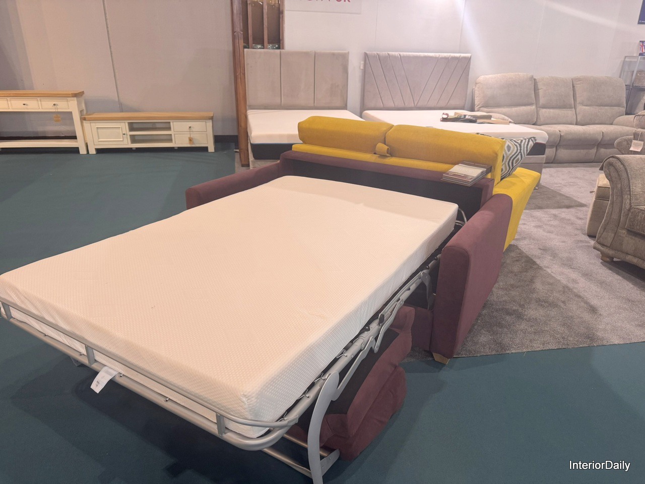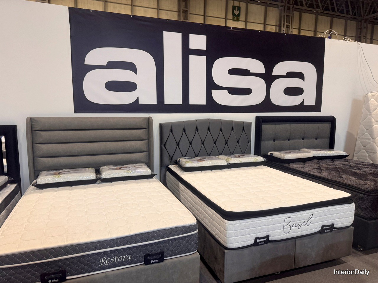 More than 5 different bedframes and mattressess shown on the stand of Alisa, each completely different than the other.