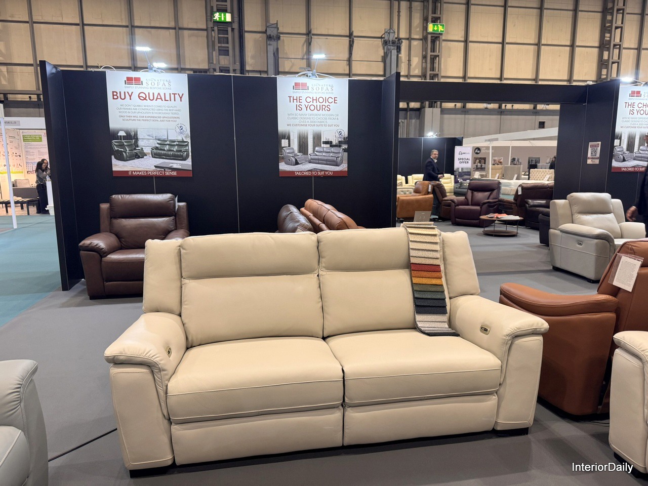 At the heart of Hall 1, visitors can explore diverse designs featuring various fabric options on one product, with standing boards offering detailed insights.