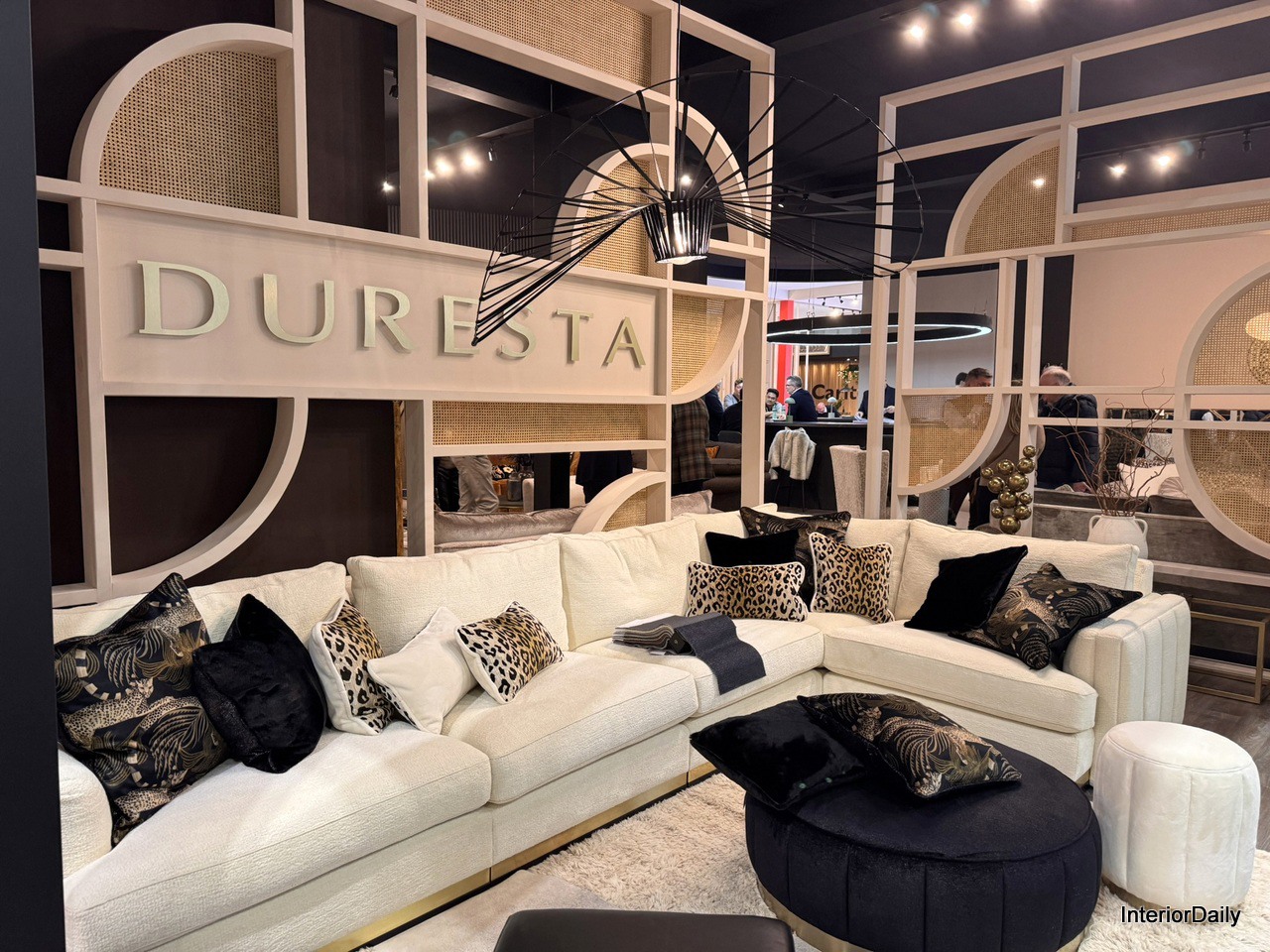 Duresta showcases a luxurious blend of white, black, and gold tones, accented with diverse cushion prints for a striking aesthetic.