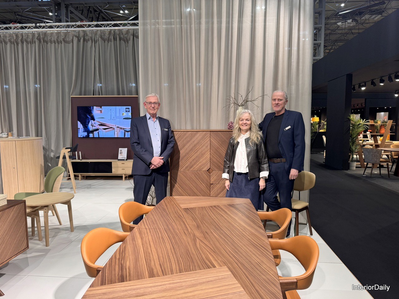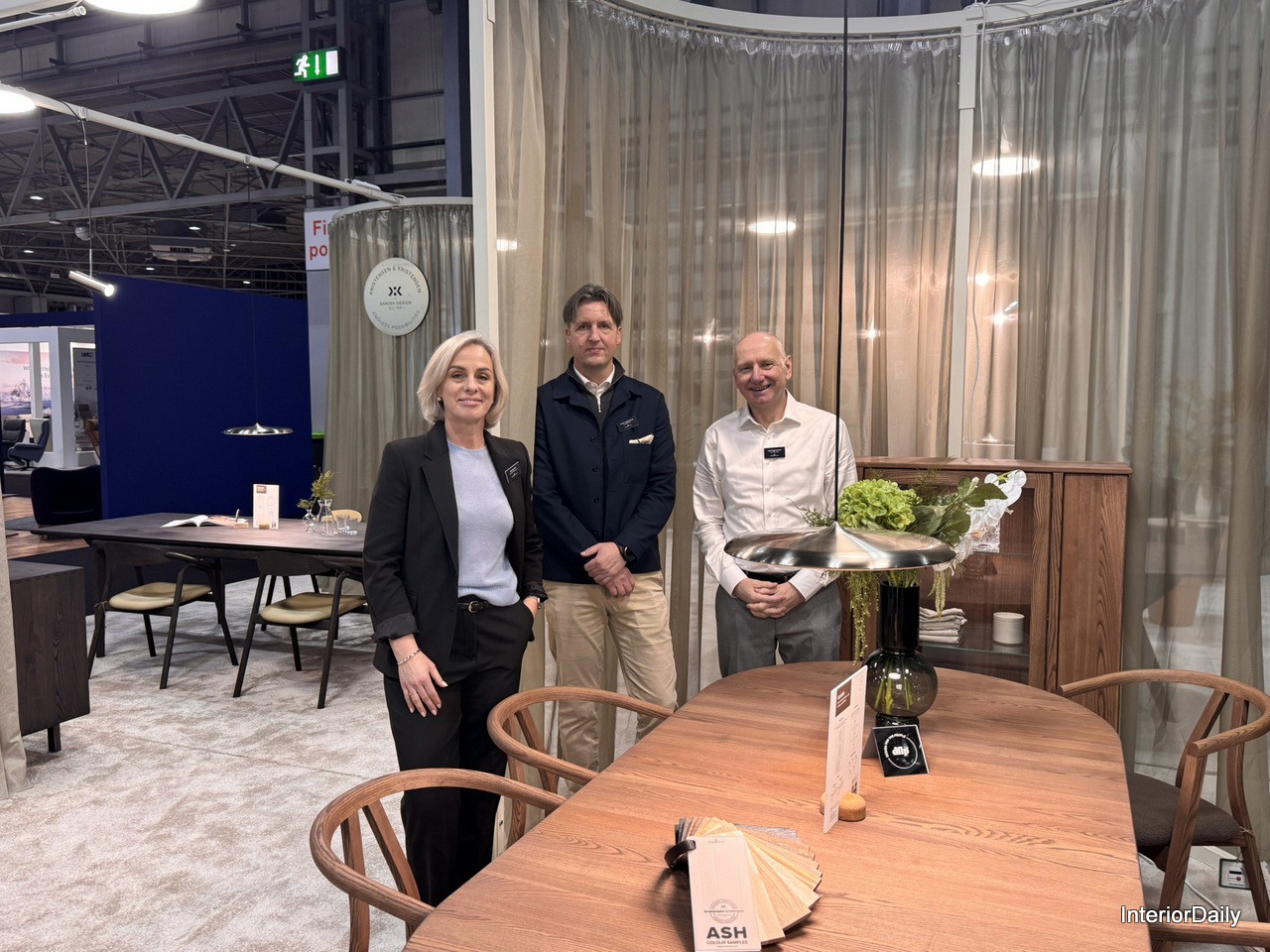 From left to right at PBJ Design Aps stand: Peter Bo Hansen, Anette Svendsen, Morten Svendsen, showcasing unique wood grain design and a central open square on the cabinet.