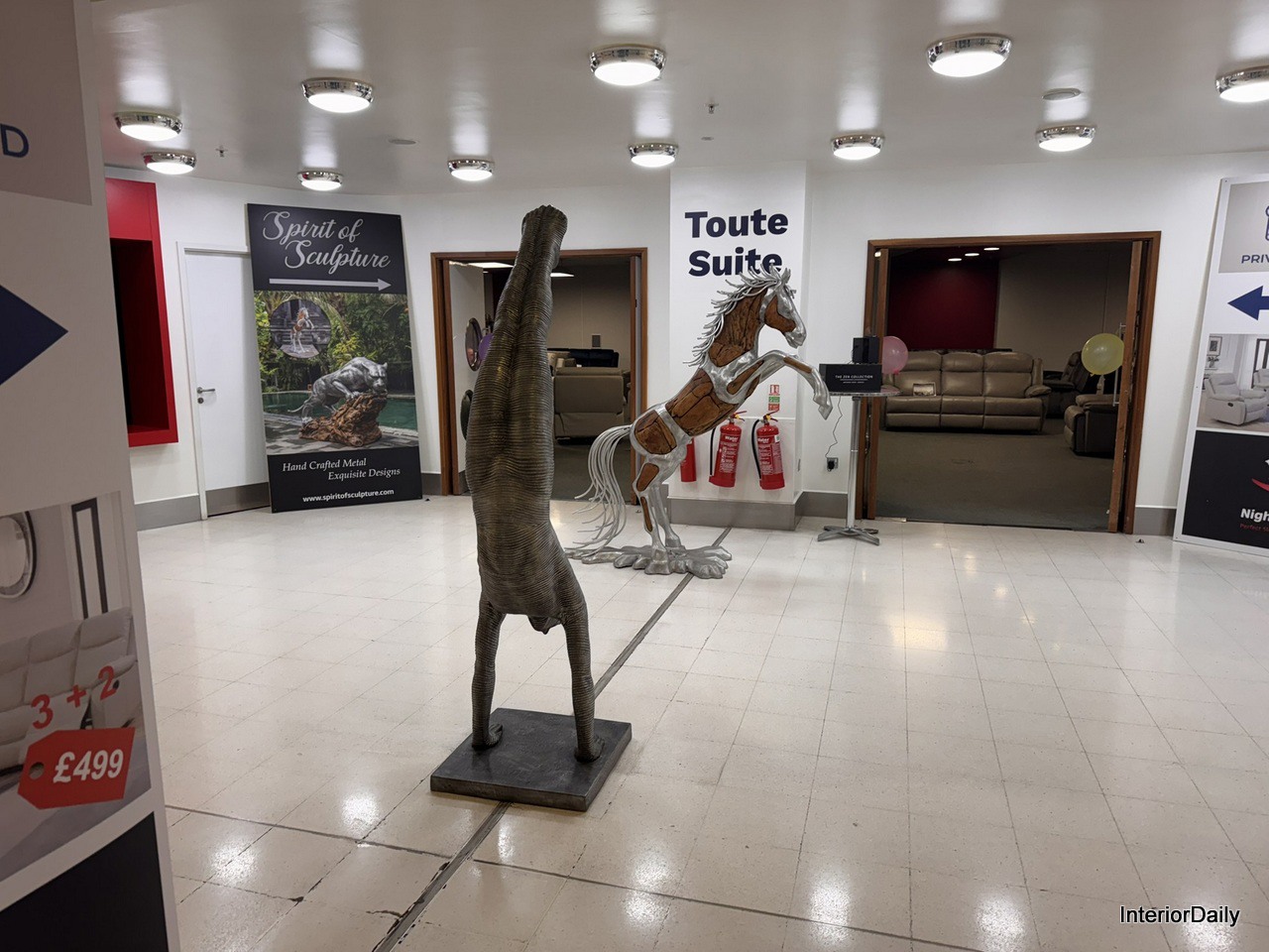 Toute Suite’s entrance showcases exquisite handcrafted metal designs, highlighted by a dynamic man doing a handstand and a powerful rearing horse.