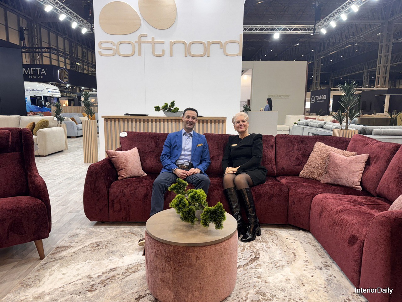 Renata Šilinskienė, Sales Director at SoftNord, and Daryl Drylie, UK Sales Manager, showcasing the newest Modular Hydra Collection, specially adjusted for the UK market with a unique double back cushion for added height.