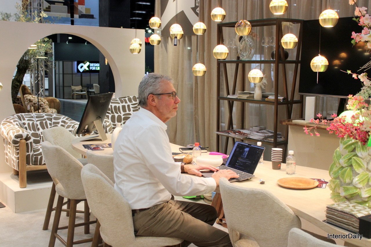 Hans Rodink, project manager at Steinhauer, worked behind his laptop as the new Belluno collection was showcased, featuring adjustable bullet lights with dimmable LEDs for enhanced table lighting and a warm ambiance.