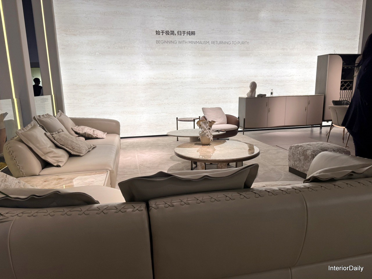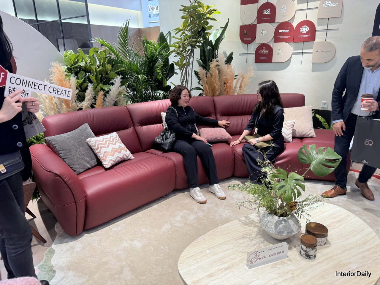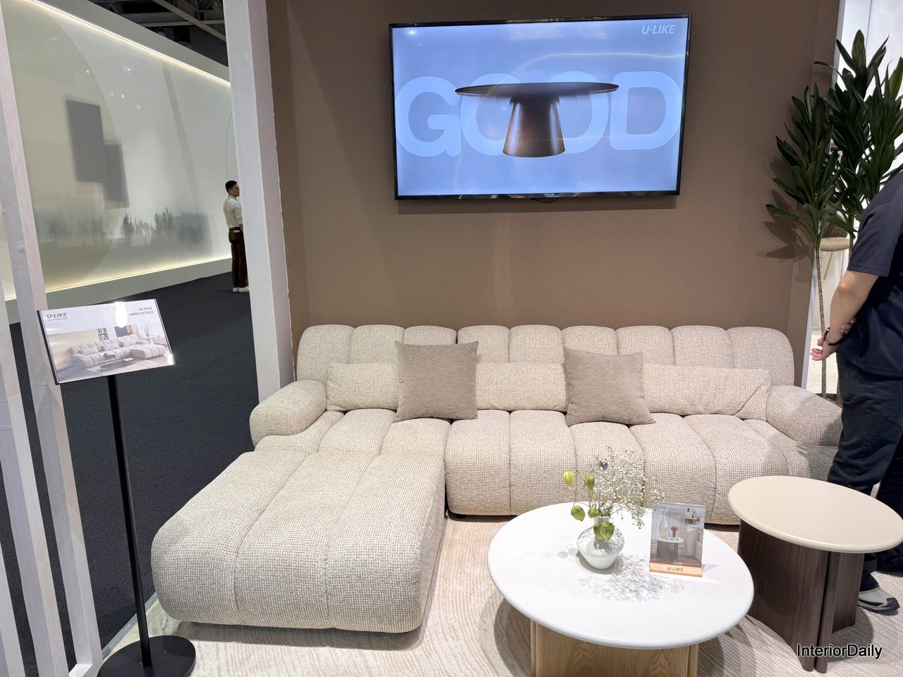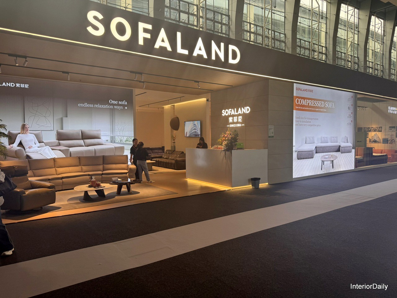 SOFALAND’s booth emphasized compressed sofas, with the latest recliner designs elegantly displayed on the left.