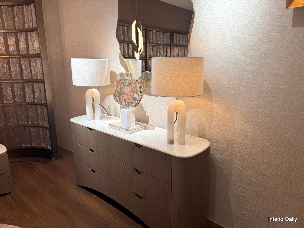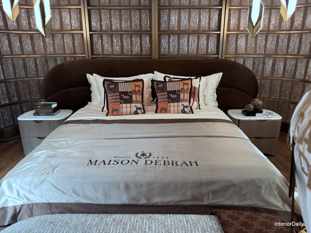 Modern lamp designs displayed alongside Maison Debrah’s newest bedding collection.