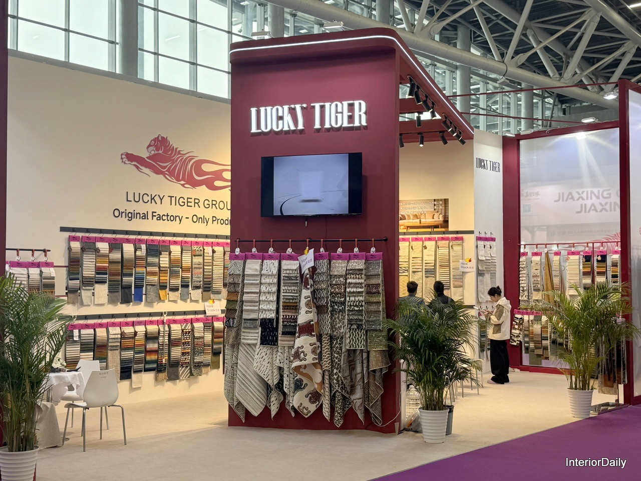 LUCKY TIGER’s stand, with walls adorned with countless fabrics.
