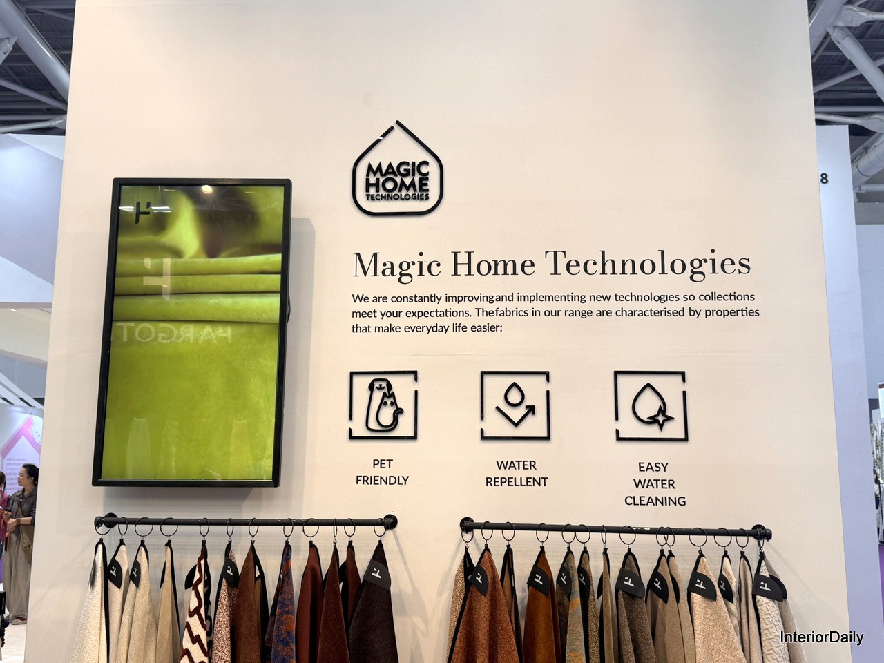 FARGOTEX’s Magic Home Technologies, featuring fabrics that are pet-friendly, water-repellent, and easy to clean with water.