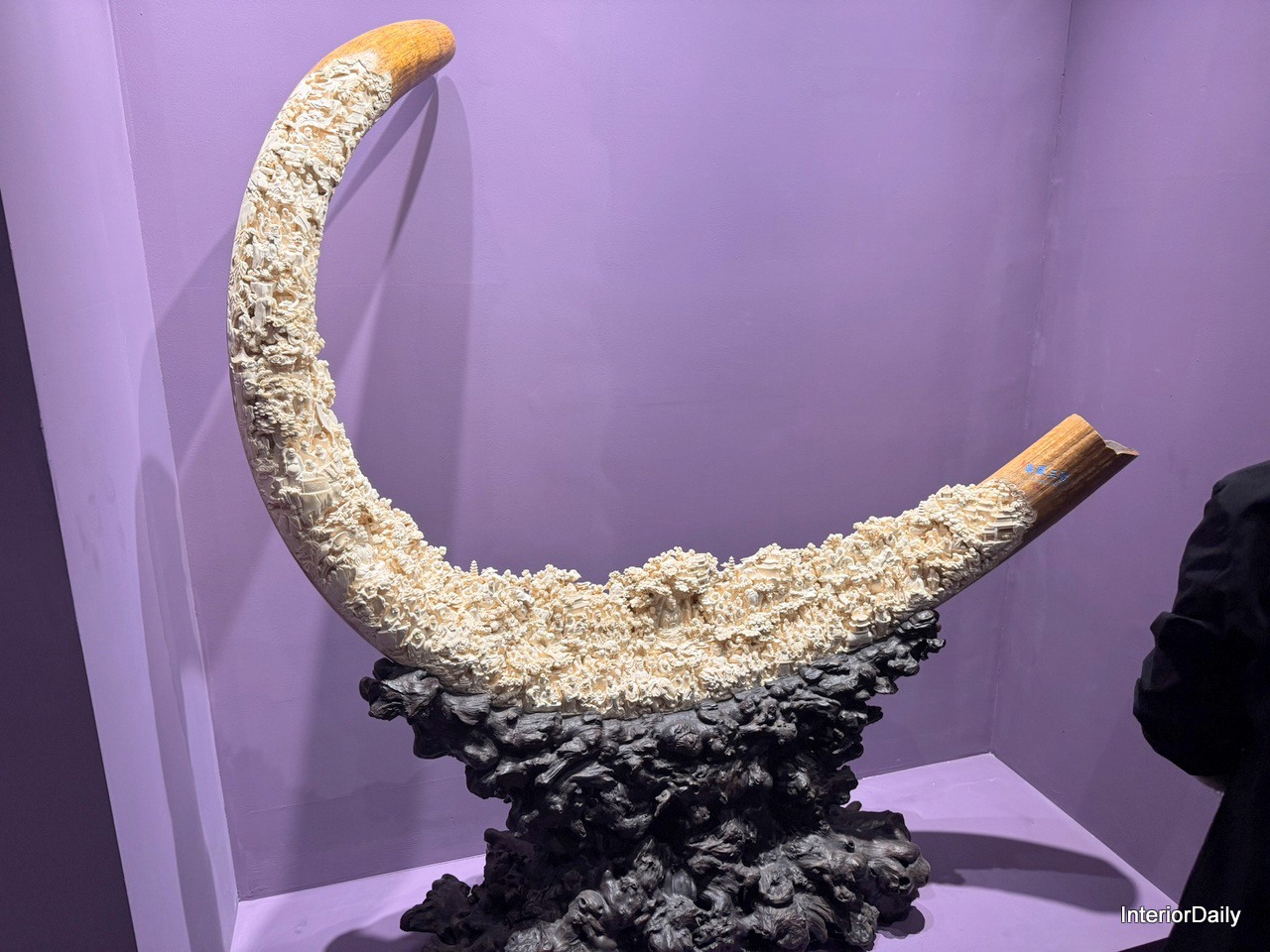 A hand-made Chinese decorative tusk, featuring intricate figures including temples, Buddhas, and other traditional motifs, detailed from end to end.