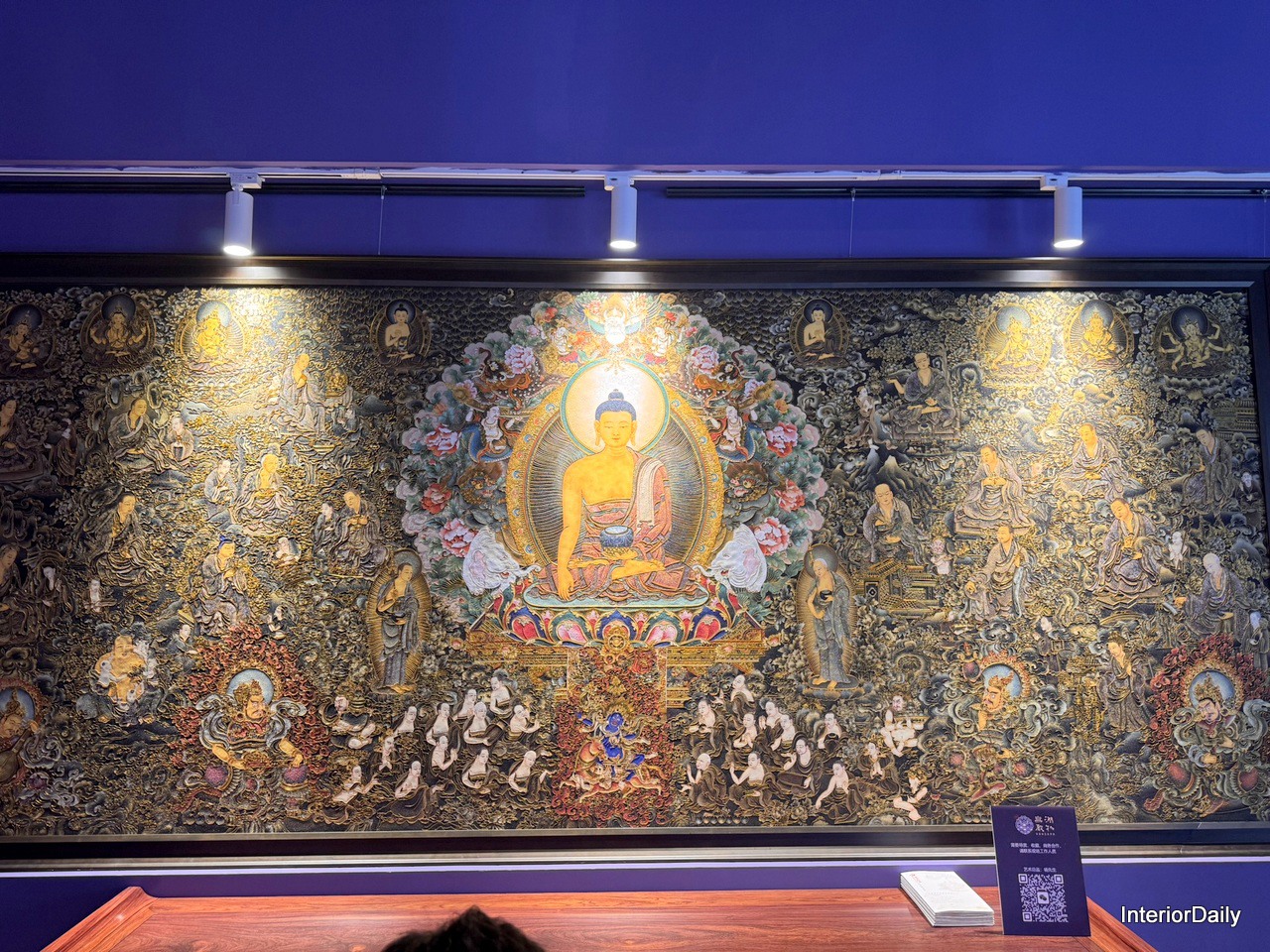 A hand-painted wall artwork with layered depth, portraying Buddha and other historical figures.